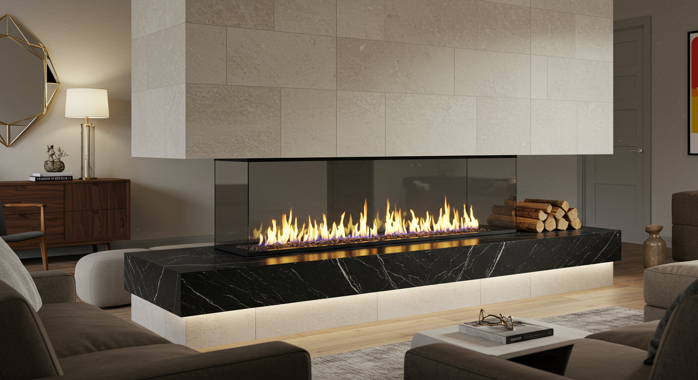 With open floor plans becoming more and more common, two or three sided fireplaces with sleek styling and elegant accents are making a comeback. Large corner or multi-sided fireplaces have become a great way to integrate a fireplace into a larger room, keeping an open floor plan with the added benefit of being able to enjoy a fireplace from more than one angle.