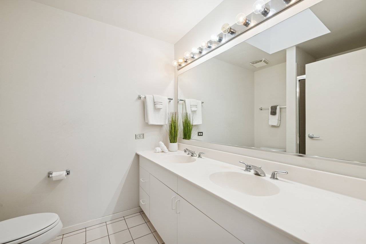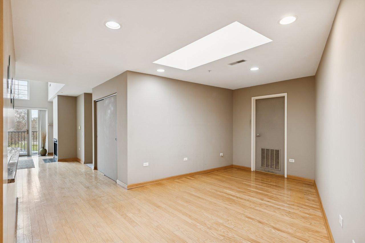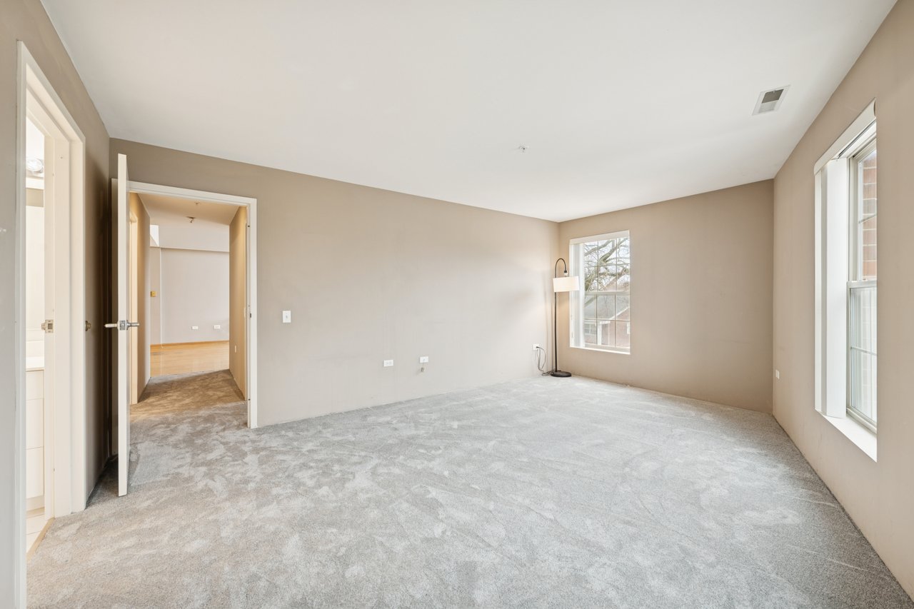 Perfectly positioned in the heart of downtown Glenview, this sun-splashed condo blends airy volume, architectural charm, and effortless everyday living. A welcoming foyer with hardwood floors opens to a dramatic living room anchored by vaulted ceilings, Palladian windows, a gas ventless fireplace, and sliding doors that usher in fresh breezes from the Juliette balcony-an ideal perch for morning coffee or golden-hour unwinding. The adjacent dining area, crowned by a skylight and recessed lighting, flows seamlessly into the well-appointed kitchen featuring granite countertops, ceramic tile flooring, soft natural light from yet another skylight, and a full suite of GE appliances. The private wing hosts a serene primary suite with a walk-in closet and an en suite bath offering a dual vanity, ceramic tile shower, and abundant skylight illumination. A spacious second bedroom and full hall bath create perfect separation for guests, work, or hobbies. Additional conveniences include in-unit laundry, same-floor storage, and two coveted parking spaces. New carpeting, thoughtful built-ins, and a location steps to dining, shops, transportation, and all the vibrancy of Glenview's urban core make this home a standout for those seeking style, ease, and proximity to everything.
