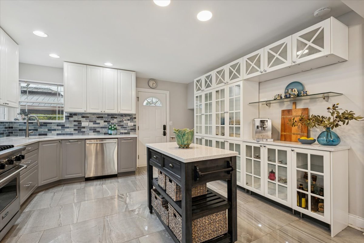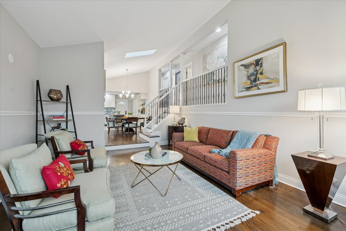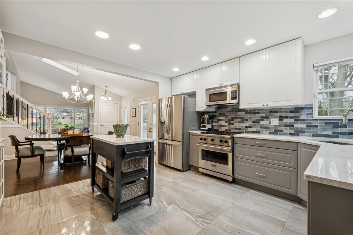 Step inside this beautifully updated split-level home where light, volume, and thoughtful design come together in all the right ways. A skylit foyer opens to airy living and dining spaces with vaulted ceilings and hardwood floors, creating an effortless backdrop for both everyday life and weekend entertaining. The renovated kitchen serves as the heart of the home with quartz countertops, glass subway tile, soft-close cabinetry, stainless steel appliances-including Viking cooking suite and a 2025 LG refrigerator-plus a center island and direct access to the backyard for seamless indoor-outdoor flow. Upstairs, the sleeping level offers three comfortable bedrooms, each with hardwood flooring and ceiling-mounted light/fan fixtures. The primary bedroom features two double-door closets, while the updated hall bath includes a quartz-topped vanity and a shower/tub with whirlpool function. Bedroom three adds a touch of personality with crown molding accented by integrated lighting. The lower level expands your living space with a bright, tiled family room, an impressive second bathroom with dual vanity, walk-in shower with bench, mosaic inlay, body sprays, and Kohler fixtures, plus a laundry/utility room equipped with a 2024 LG washer, Maytag dryer, utility sink, cabinetry, and direct yard access. Outside, enjoy a fenced yard with a concrete patio and gazebo-perfect for al-fresco dining, lounging, or simply soaking up summer evenings. Mechanical updates bring peace of mind, including 100-amp electrical, Armstrong furnace (2025) with humidifier, Rinnai tankless water heater (2020), sump pump (2021), Carrier AC, Walter filter (2020), asphalt driveway, and Nest thermostat. A home that balances comfort with curated updates-move-in ready, wonderfully maintained, and designed for the way people actually live today. Perfectly poised for its next chapter.