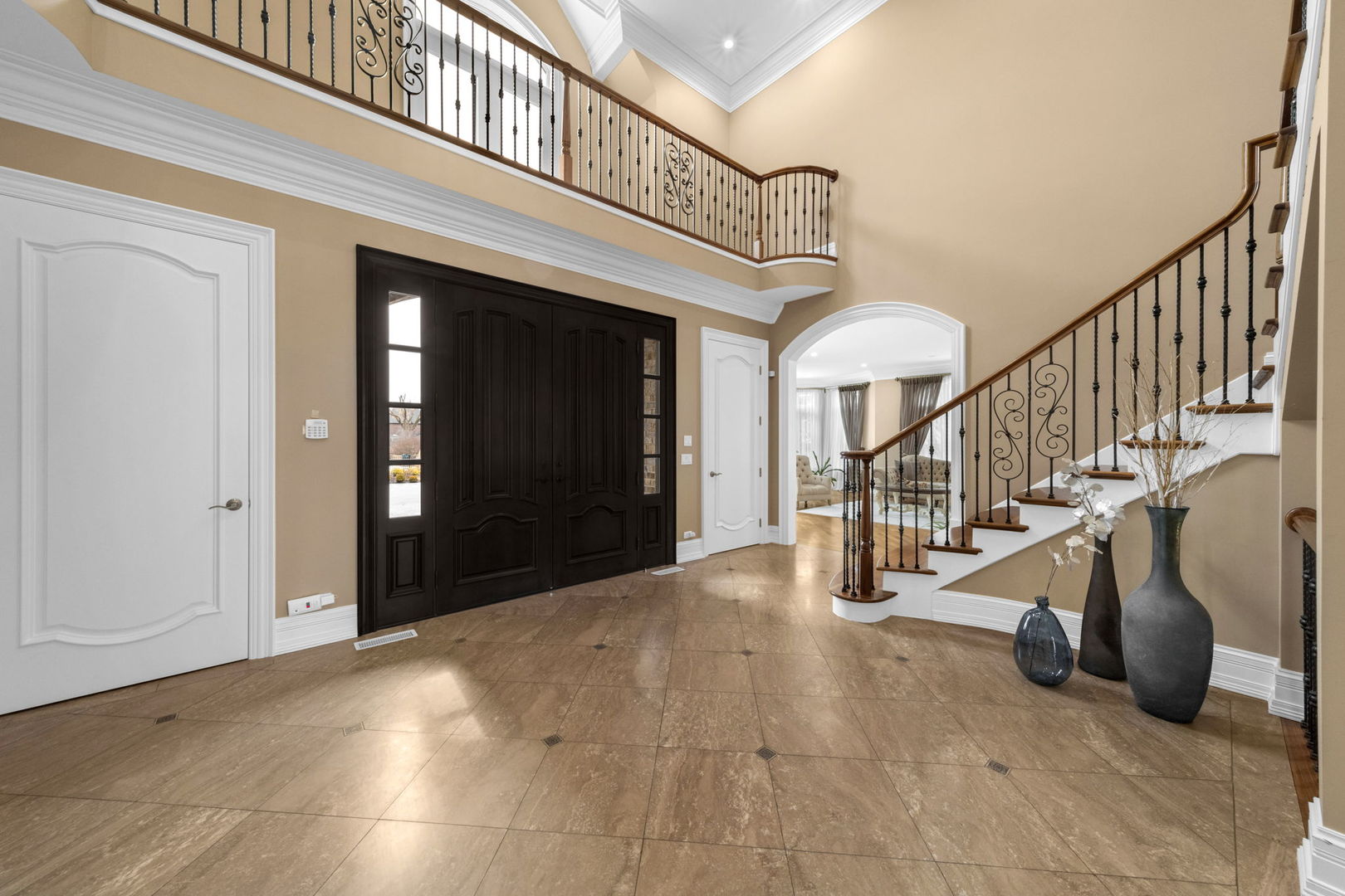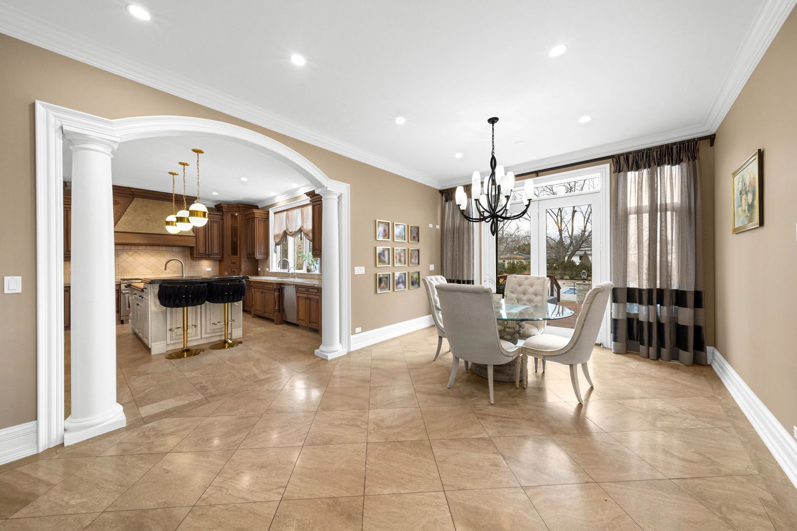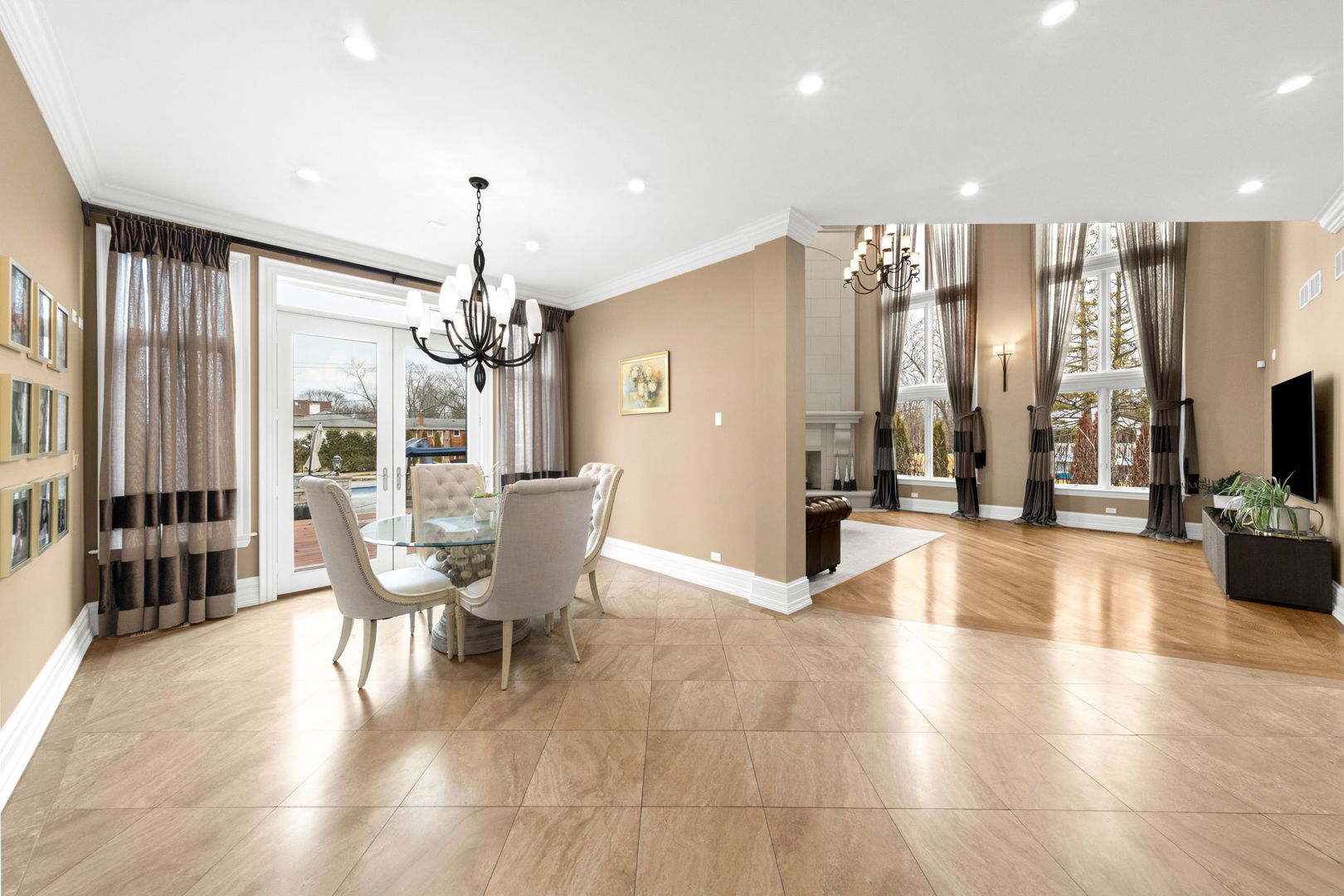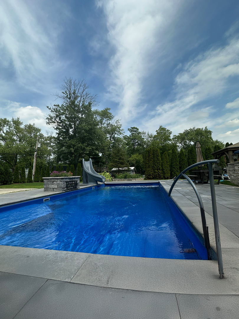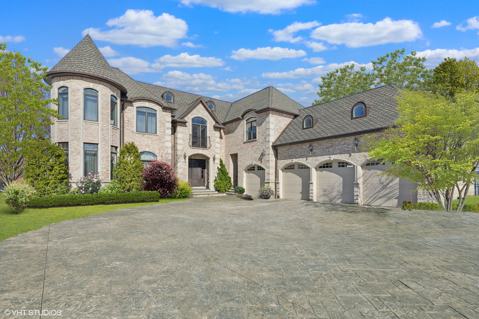 A masterpiece of architectural elegance and modern luxury, this all-brick and stone estate is a sanctuary of sophistication. Beyond its gated entry, a heated four-car garage with a Tesla charger sets the stage for unparalleled comfort. A grand two-story foyer with travertine marble flooring, coffered ceilings, and exquisite crown molding welcomes you inside. The living and dining rooms impress with diagonally laid hardwood floors, recessed lighting, and intricate molding, seamlessly connecting through arched doorways. The chef's kitchen is a culinary dream, boasting travertine marble floors, granite countertops, and high-end Wolf and Thermador appliances. The adjacent breakfast nook leads to a stamped concrete patio, perfect for morning coffee. The family room, with its soaring ceilings and limestone-framed gas fireplace, offers a refined yet cozy retreat. A versatile office or 5th ensuite bedroom, a mudroom with built-in lockers, and a well-equipped laundry room complete the main level. The primary suite is a private haven, featuring hardwood floors, a tray ceiling, and a custom walk-in closet. Its spa-like bath indulges with heated travertine floors, dual granite vanities, a rainfall shower with multiple sprays, steam shower and an airjet tub. Three additional ensuite bedrooms, each with bespoke finishes, ensure comfort and privacy along with an additional finished flex space perfect for additional play or craft room. The third-floor finished art studio is illuminated by recessed lighting, offers flexibility for creative pursuits or simply a total private work from home space. Designed for entertaining, the lower level presents a plush theater with tiered seating, a recreation room with a gas fireplace, and a sophisticated wet bar with high-end appliances and seating for four. A guest bedroom and bath offer additional accommodations and the best part of the lower level - the dry sauna! Step outside to a private resort-like oasis, where a saltwater fiberglass pool with an electric cover, slide, and water features takes center stage. A concrete sports court is primed for endless activities, while a gazebo with a built-in grill invites al fresco dining. Additional features include a stamped concrete driveway, wood deck, Ecobee thermostat system, four Trane furnaces with Aprilaire humidifiers, a Generac generator, a sprinkler system, an electric fence, a sauna, dual 75-gallon water heaters, and a sump pump with battery backup. Seamlessly blending timeless elegance with modern convenience, this extraordinary residence is the epitome of luxury living.