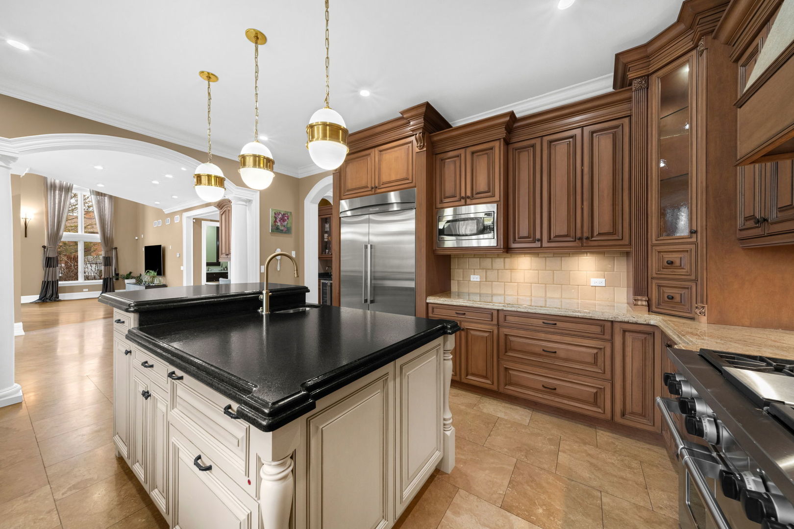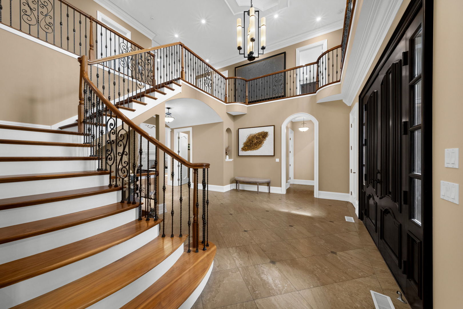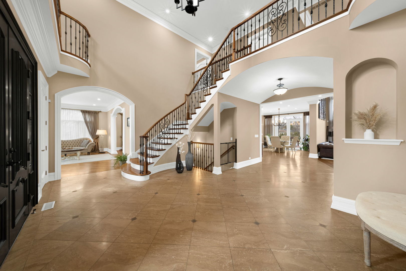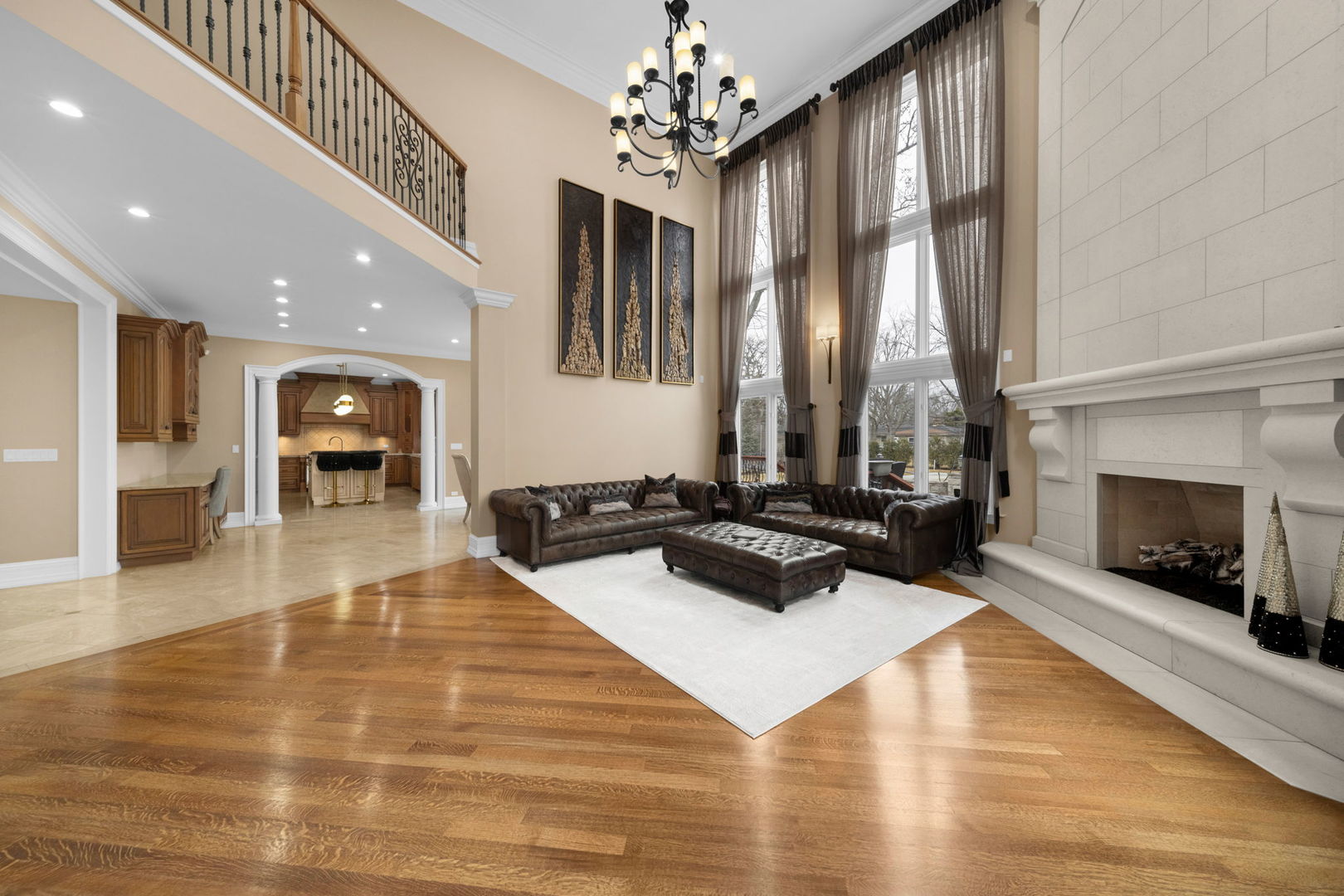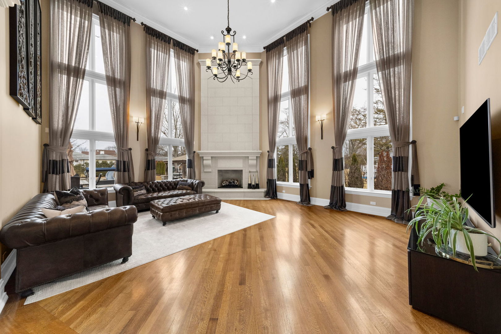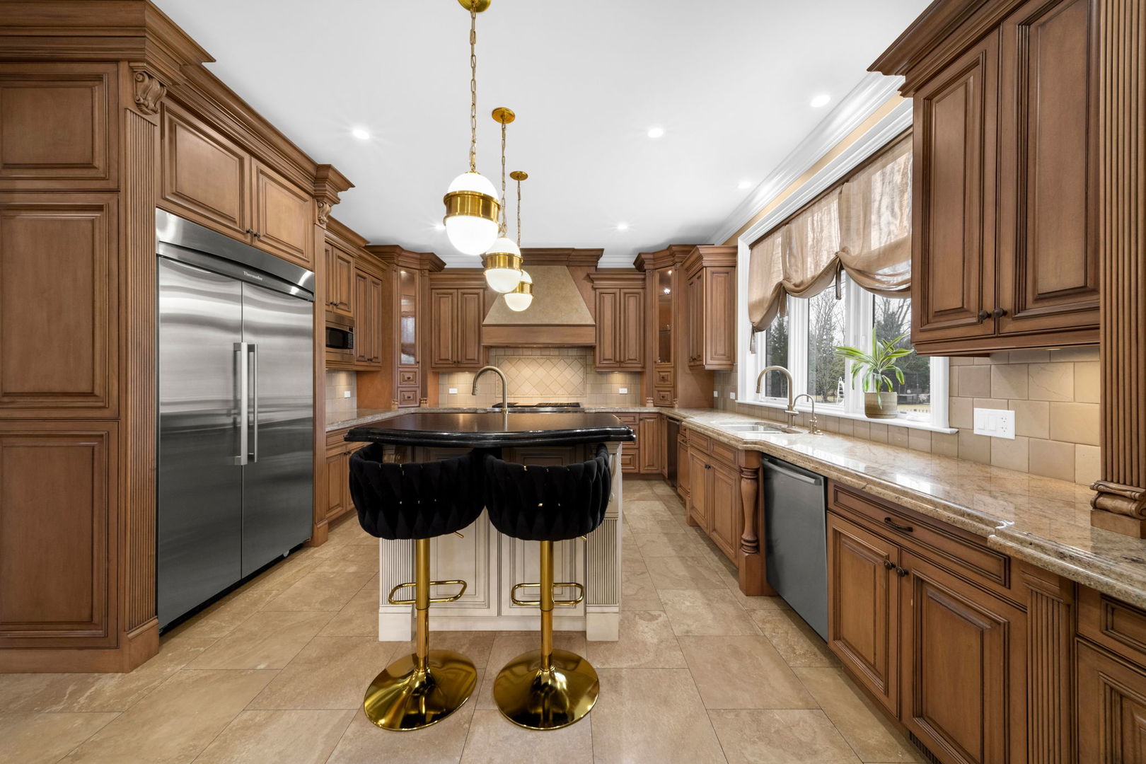 A masterpiece of architectural elegance and modern luxury, this all-brick and stone estate is a sanctuary of sophistication. Beyond its gated entry, a heated four-car garage with a Tesla charger sets the stage for unparalleled comfort. A grand two-story foyer with travertine marble flooring, coffered ceilings, and exquisite crown molding welcomes you inside. The living and dining rooms impress with diagonally laid hardwood floors, recessed lighting, and intricate molding, seamlessly connecting through arched doorways. The chef's kitchen is a culinary dream, boasting travertine marble floors, granite countertops, and high-end Wolf and Thermador appliances. The adjacent breakfast nook leads to a stamped concrete patio, perfect for morning coffee. The family room, with its soaring ceilings and limestone-framed gas fireplace, offers a refined yet cozy retreat. A versatile office or 5th ensuite bedroom, a mudroom with built-in lockers, and a well-equipped laundry room complete the main level. The primary suite is a private haven, featuring hardwood floors, a tray ceiling, and a custom walk-in closet. Its spa-like bath indulges with heated travertine floors, dual granite vanities, a rainfall shower with multiple sprays, steam shower and an airjet tub. Three additional ensuite bedrooms, each with bespoke finishes, ensure comfort and privacy along with an additional finished flex space perfect for additional play or craft room. The third-floor finished art studio is illuminated by recessed lighting, offers flexibility for creative pursuits or simply a total private work from home space. Designed for entertaining, the lower level presents a plush theater with tiered seating, a recreation room with a gas fireplace, and a sophisticated wet bar with high-end appliances and seating for four. A guest bedroom and bath offer additional accommodations and the best part of the lower level - the dry sauna! Step outside to a private resort-like oasis, where a saltwater fiberglass pool with an electric cover, slide, and water features takes center stage. A concrete sports court is primed for endless activities, while a gazebo with a built-in grill invites al fresco dining. Additional features include a stamped concrete driveway, wood deck, Ecobee thermostat system, four Trane furnaces with Aprilaire humidifiers, a Generac generator, a sprinkler system, an electric fence, a sauna, dual 75-gallon water heaters, and a sump pump with battery backup. Seamlessly blending timeless elegance with modern convenience, this extraordinary residence is the epitome of luxury living.