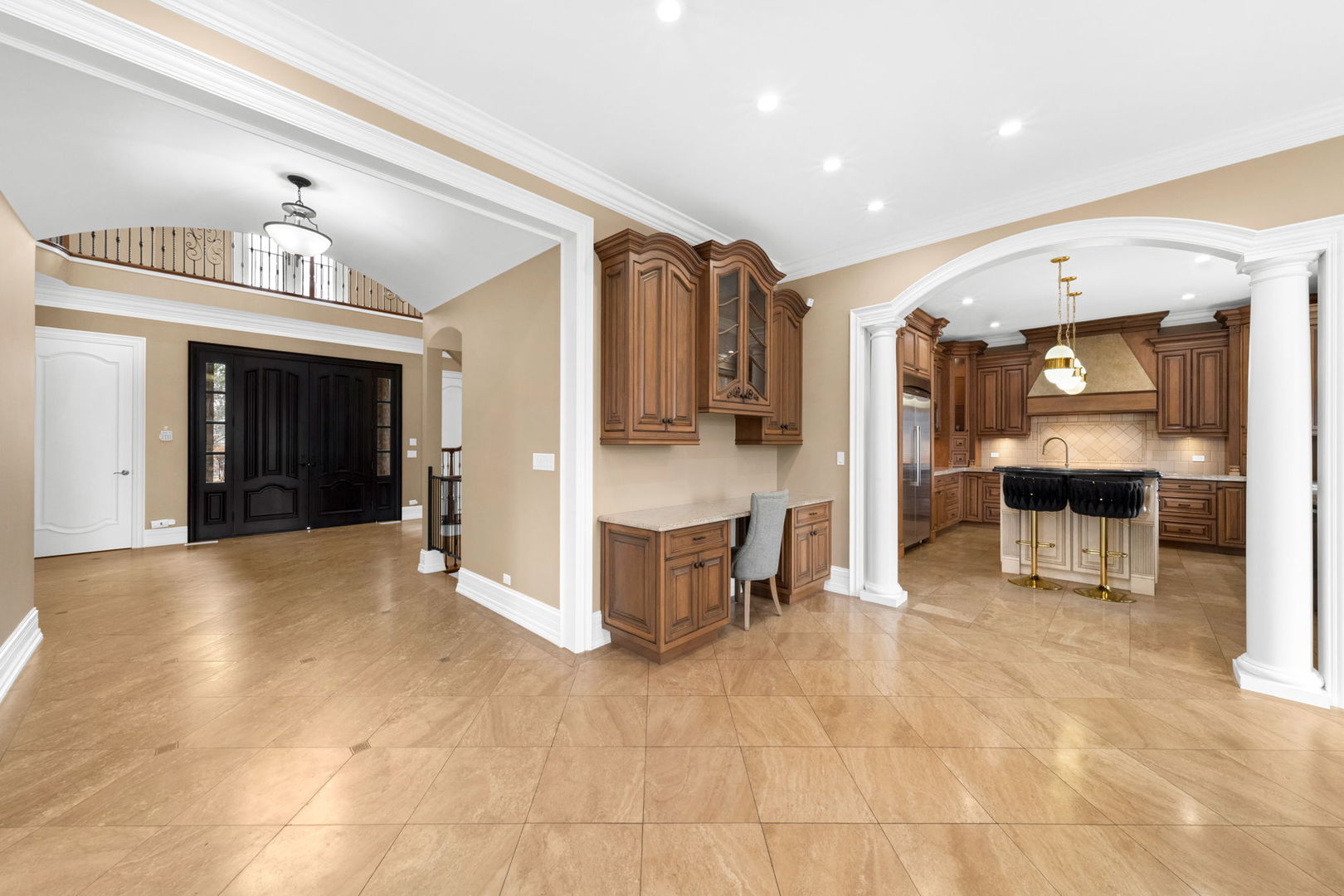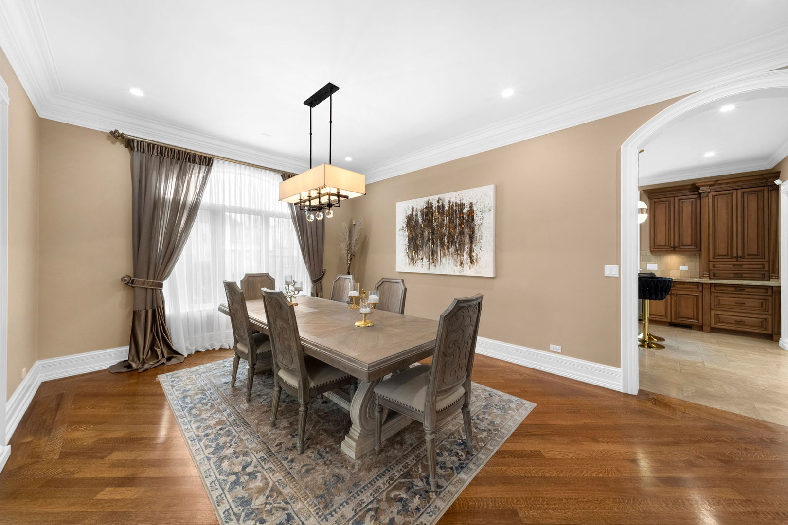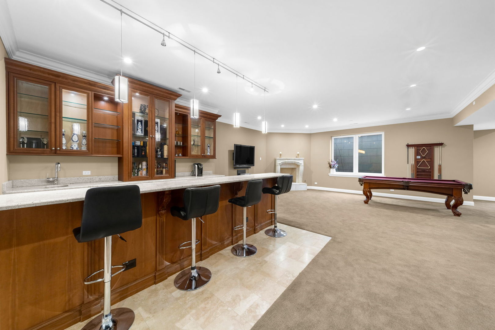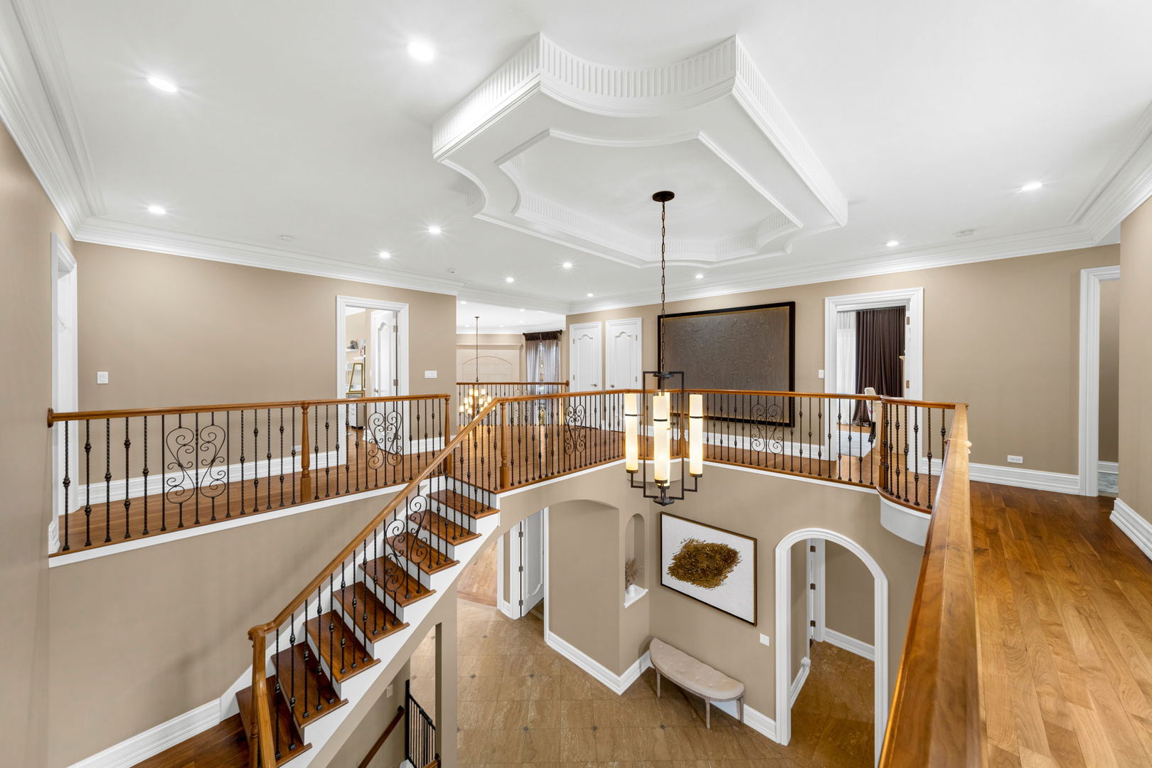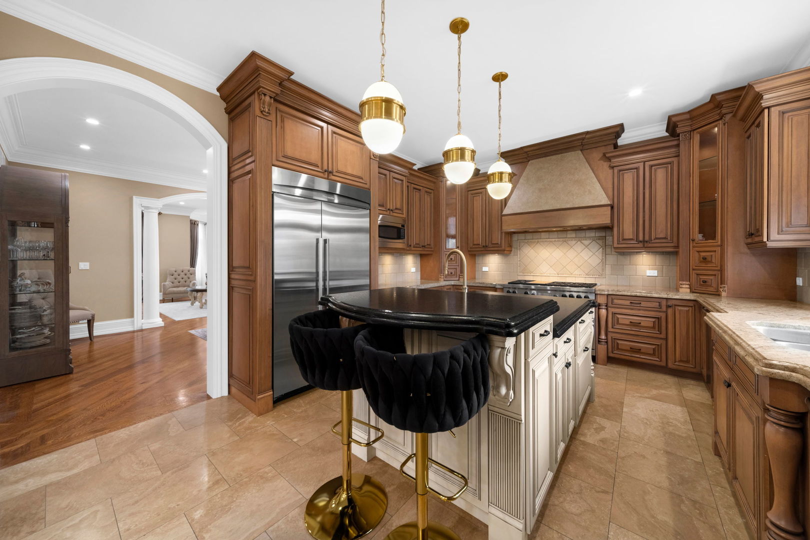 A masterpiece of architectural elegance and modern luxury, this all-brick and stone estate is a sanctuary of sophistication. Beyond its gated entry, a heated four-car garage with a Tesla charger sets the stage for unparalleled comfort. A grand two-story foyer with travertine marble flooring, coffered ceilings, and exquisite crown molding welcomes you inside. The living and dining rooms impress with diagonally laid hardwood floors, recessed lighting, and intricate molding, seamlessly connecting through arched doorways. The chef's kitchen is a culinary dream, boasting travertine marble floors, granite countertops, and high-end Wolf and Thermador appliances. The adjacent breakfast nook leads to a stamped concrete patio, perfect for morning coffee. The family room, with its soaring ceilings and limestone-framed gas fireplace, offers a refined yet cozy retreat. A versatile office or 5th ensuite bedroom, a mudroom with built-in lockers, and a well-equipped laundry room complete the main level. The primary suite is a private haven, featuring hardwood floors, a tray ceiling, and a custom walk-in closet. Its spa-like bath indulges with heated travertine floors, dual granite vanities, a rainfall shower with multiple sprays, steam shower and an airjet tub. Three additional ensuite bedrooms, each with bespoke finishes, ensure comfort and privacy along with an additional finished flex space perfect for additional play or craft room. The third-floor finished art studio is illuminated by recessed lighting, offers flexibility for creative pursuits or simply a total private work from home space. Designed for entertaining, the lower level presents a plush theater with tiered seating, a recreation room with a gas fireplace, and a sophisticated wet bar with high-end appliances and seating for four. A guest bedroom and bath offer additional accommodations and the best part of the lower level - the dry sauna! Step outside to a private resort-like oasis, where a saltwater fiberglass pool with an electric cover, slide, and water features takes center stage. A concrete sports court is primed for endless activities, while a gazebo with a built-in grill invites al fresco dining. Additional features include a stamped concrete driveway, wood deck, Ecobee thermostat system, four Trane furnaces with Aprilaire humidifiers, a Generac generator, a sprinkler system, an electric fence, a sauna, dual 75-gallon water heaters, and a sump pump with battery backup. Seamlessly blending timeless elegance with modern convenience, this extraordinary residence is the epitome of luxury living.