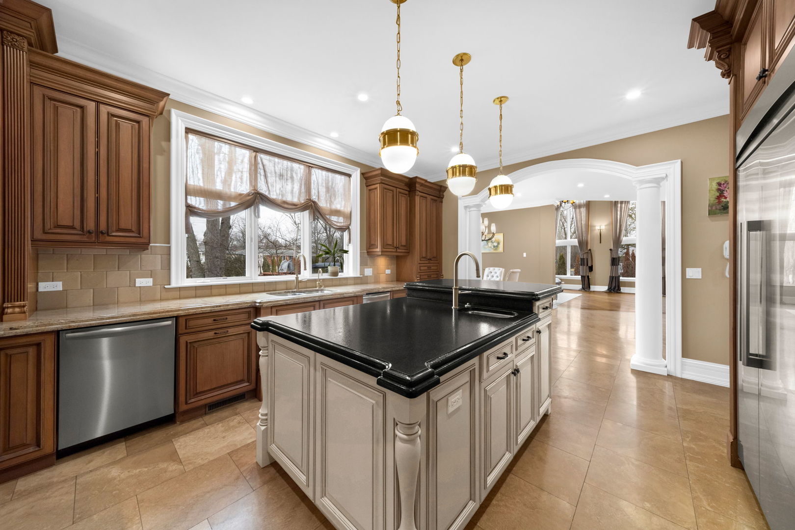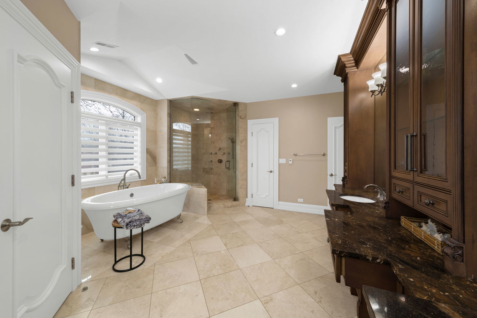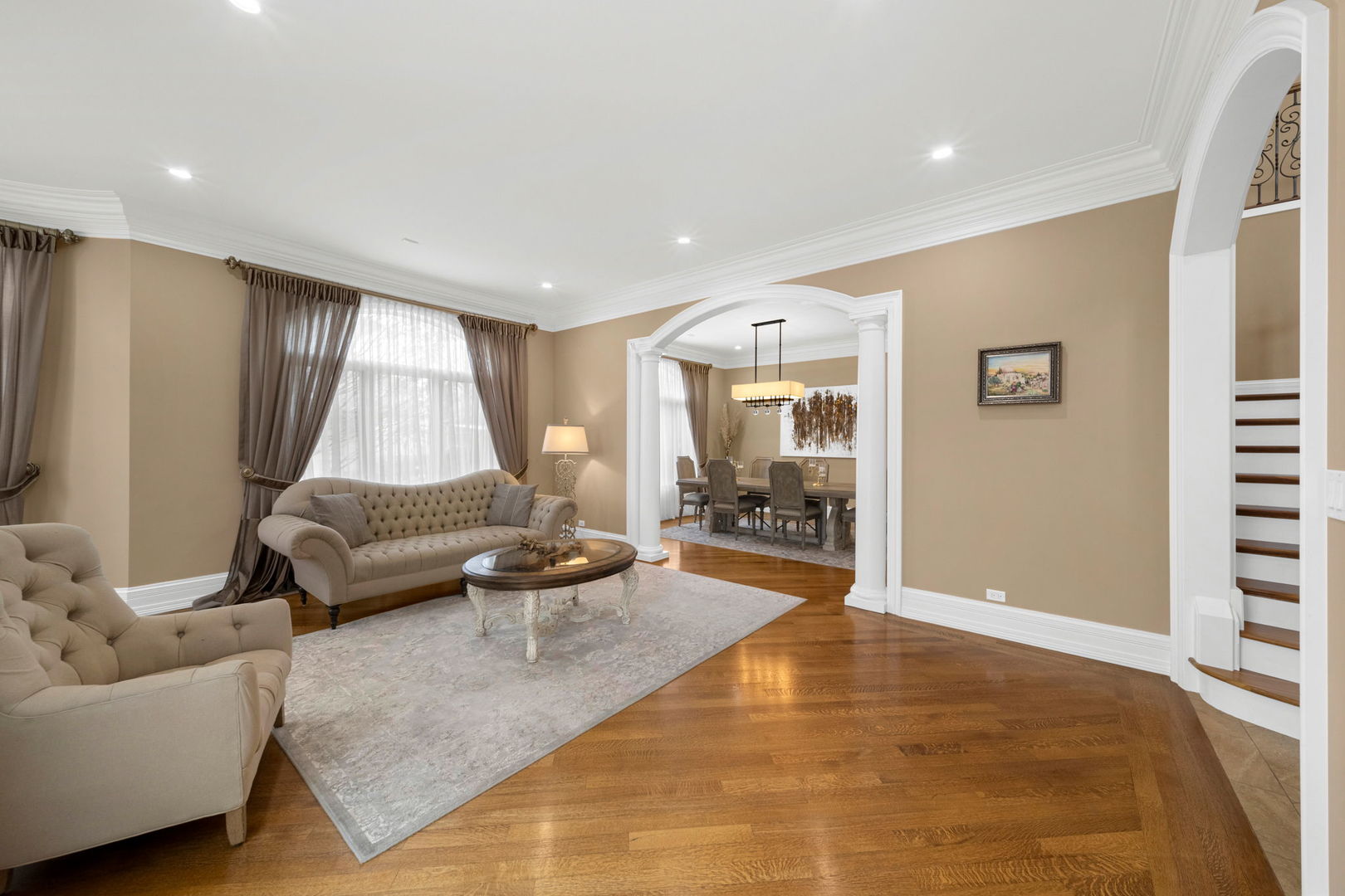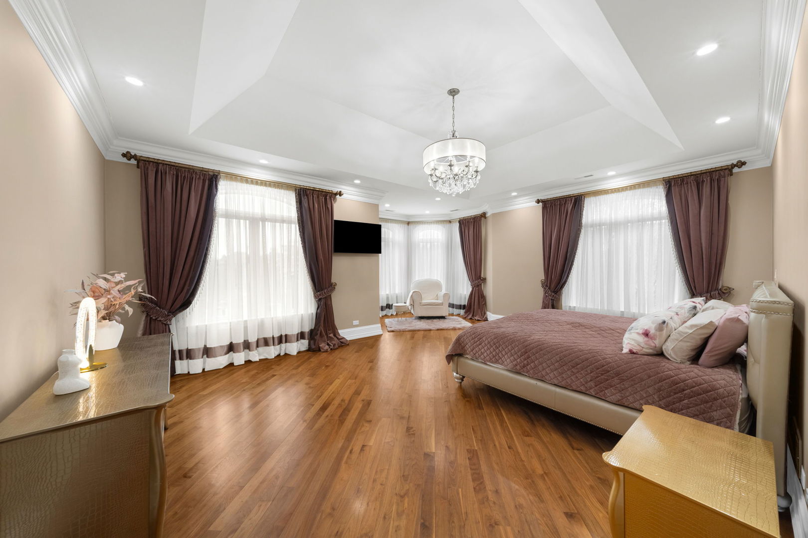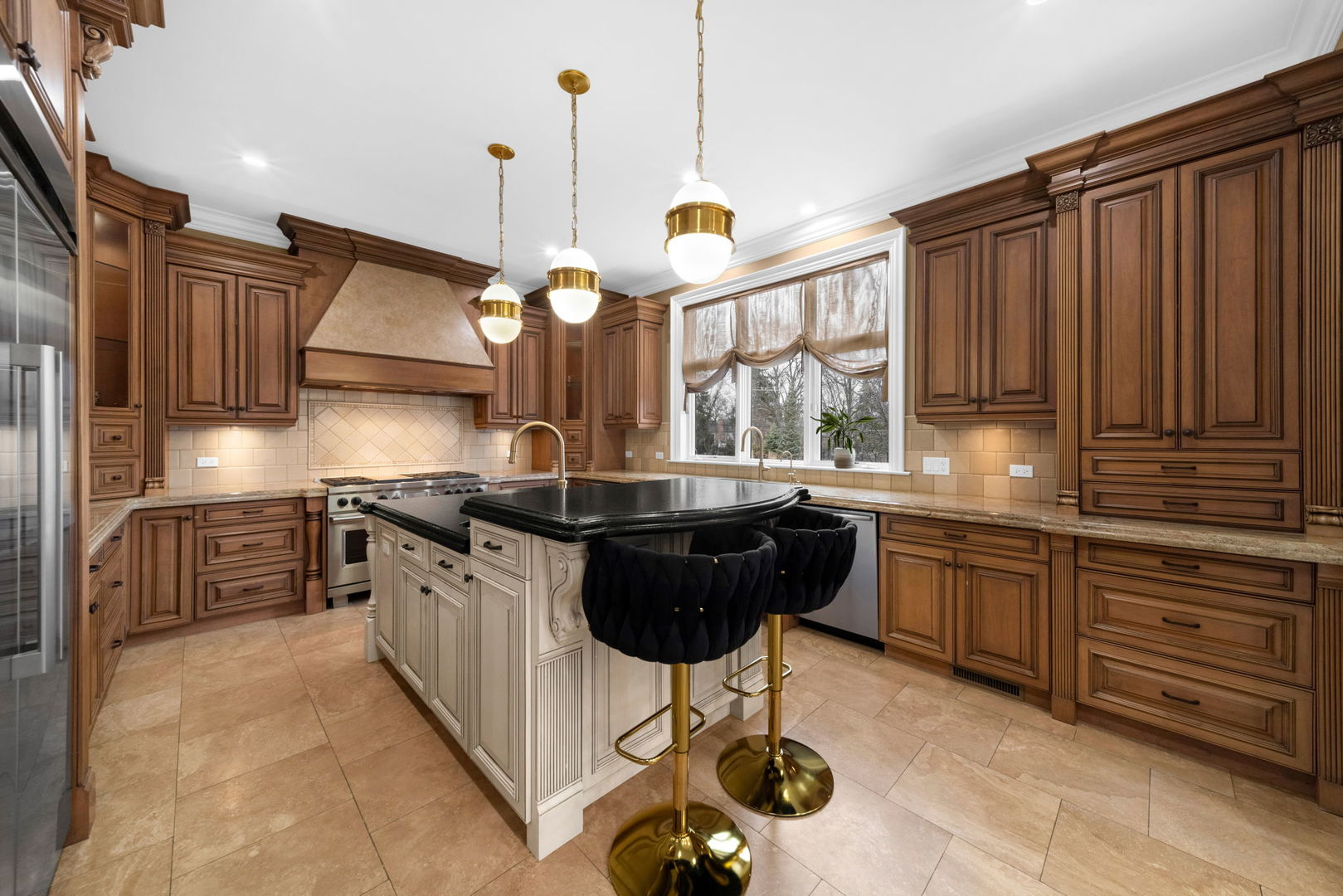 A masterpiece of architectural elegance and modern luxury, this all-brick and stone estate is a sanctuary of sophistication. Beyond its gated entry, a heated four-car garage with a Tesla charger sets the stage for unparalleled comfort. A grand two-story foyer with travertine marble flooring, coffered ceilings, and exquisite crown molding welcomes you inside. The living and dining rooms impress with diagonally laid hardwood floors, recessed lighting, and intricate molding, seamlessly connecting through arched doorways. The chef's kitchen is a culinary dream, boasting travertine marble floors, granite countertops, and high-end Wolf and Thermador appliances. The adjacent breakfast nook leads to a stamped concrete patio, perfect for morning coffee. The family room, with its soaring ceilings and limestone-framed gas fireplace, offers a refined yet cozy retreat. A versatile office or 5th ensuite bedroom, a mudroom with built-in lockers, and a well-equipped laundry room complete the main level. The primary suite is a private haven, featuring hardwood floors, a tray ceiling, and a custom walk-in closet. Its spa-like bath indulges with heated travertine floors, dual granite vanities, a rainfall shower with multiple sprays, steam shower and an airjet tub. Three additional ensuite bedrooms, each with bespoke finishes, ensure comfort and privacy along with an additional finished flex space perfect for additional play or craft room. The third-floor finished art studio is illuminated by recessed lighting, offers flexibility for creative pursuits or simply a total private work from home space. Designed for entertaining, the lower level presents a plush theater with tiered seating, a recreation room with a gas fireplace, and a sophisticated wet bar with high-end appliances and seating for four. A guest bedroom and bath offer additional accommodations and the best part of the lower level - the dry sauna! Step outside to a private resort-like oasis, where a saltwater fiberglass pool with an electric cover, slide, and water features takes center stage. A concrete sports court is primed for endless activities, while a gazebo with a built-in grill invites al fresco dining. Additional features include a stamped concrete driveway, wood deck, Ecobee thermostat system, four Trane furnaces with Aprilaire humidifiers, a Generac generator, a sprinkler system, an electric fence, a sauna, dual 75-gallon water heaters, and a sump pump with battery backup. Seamlessly blending timeless elegance with modern convenience, this extraordinary residence is the epitome of luxury living.