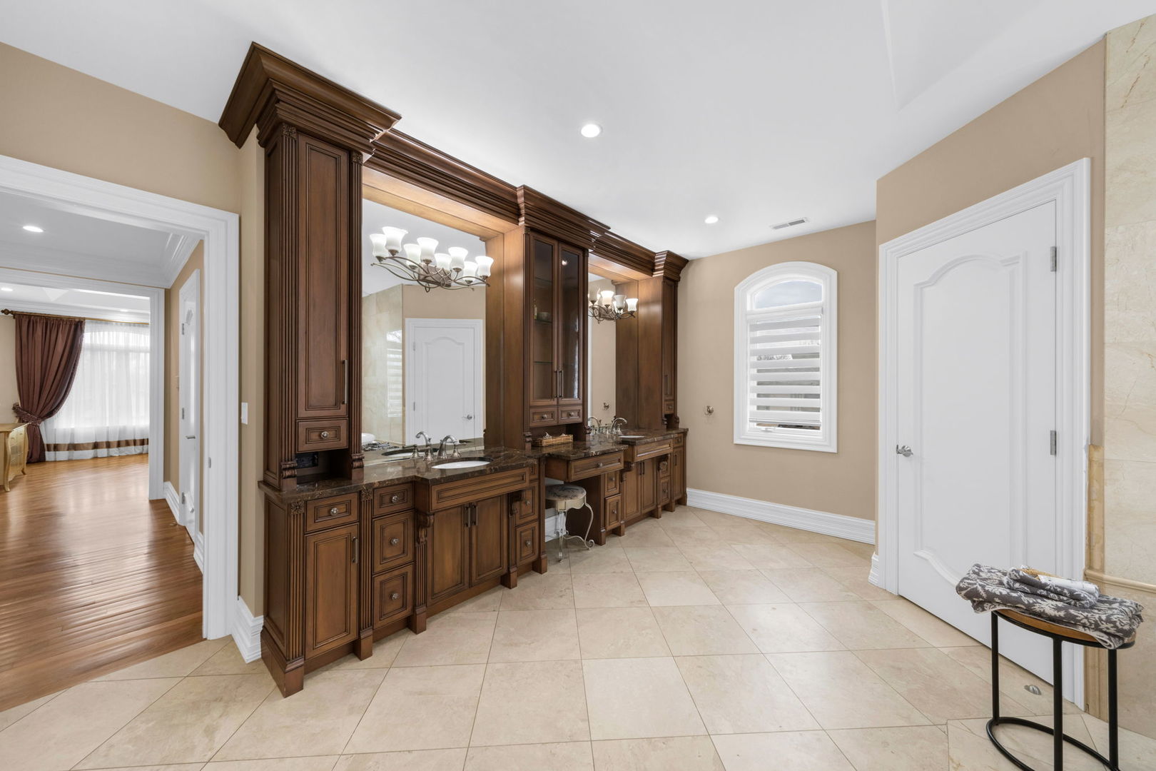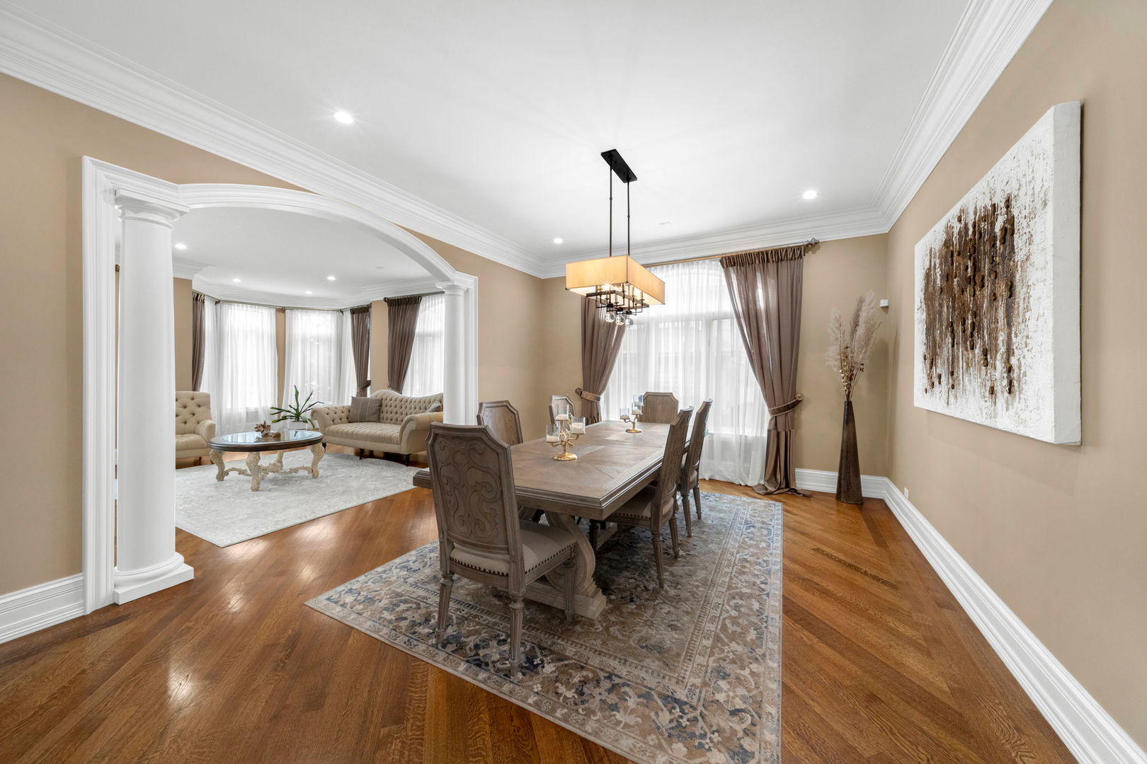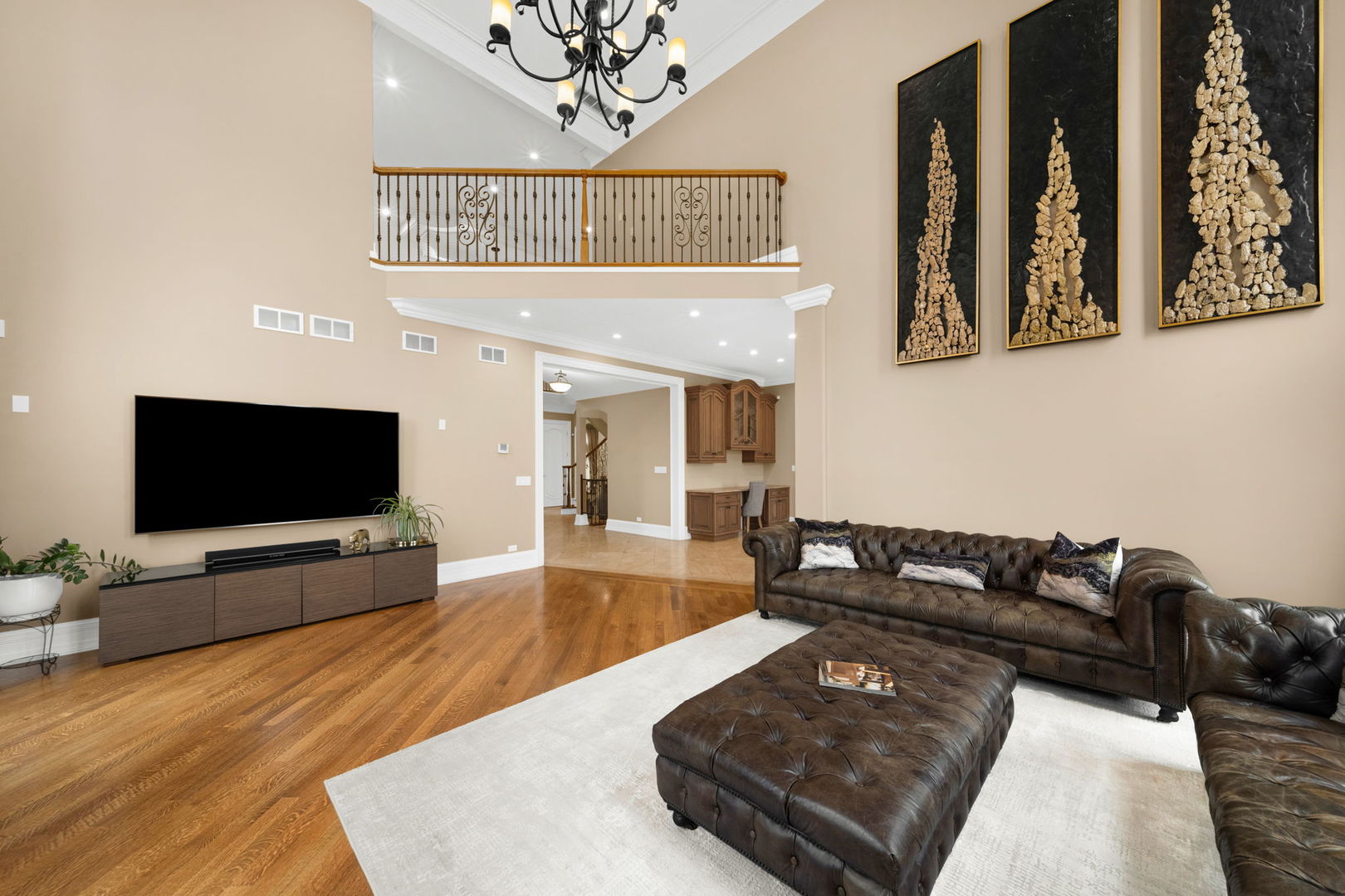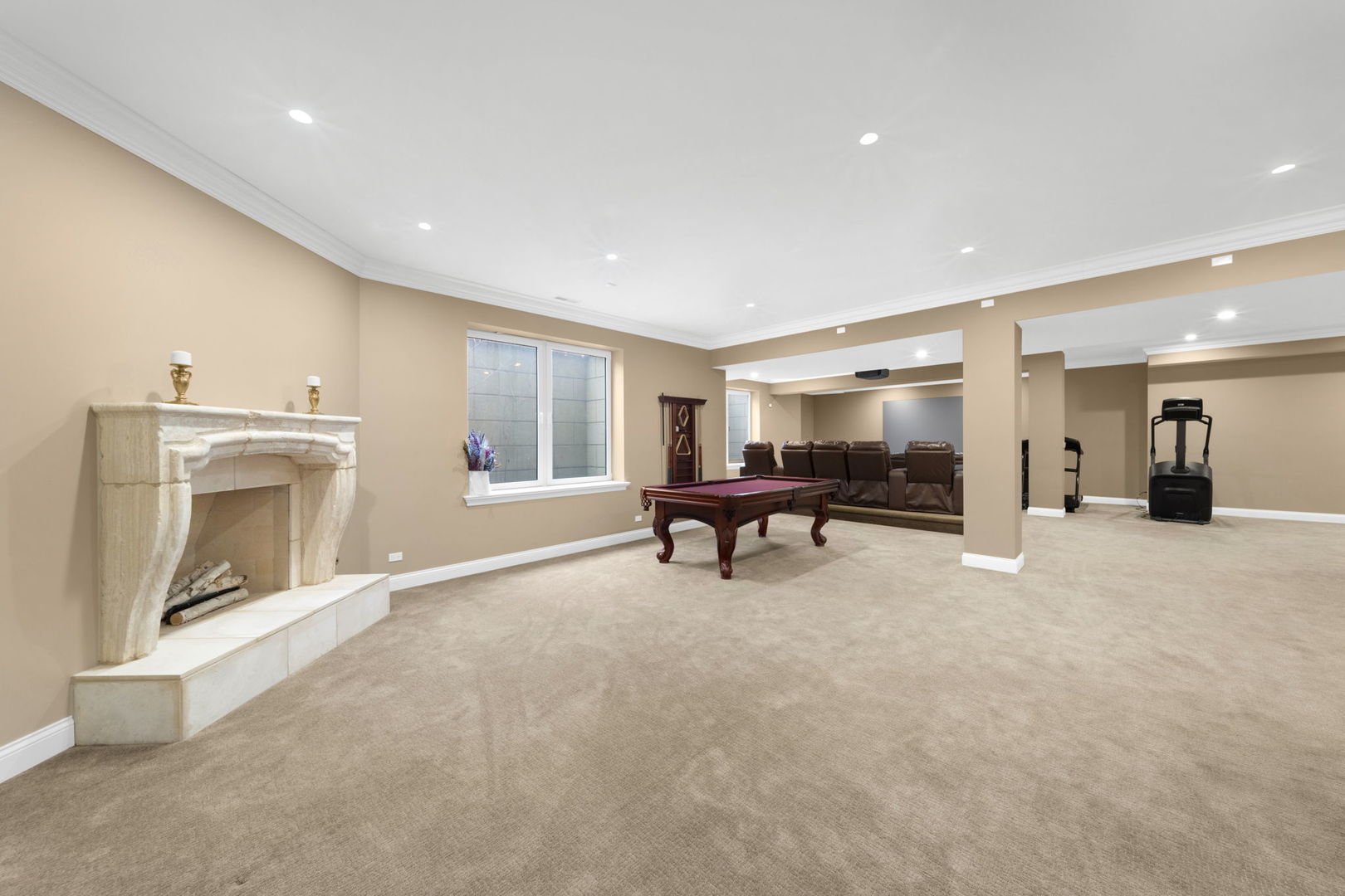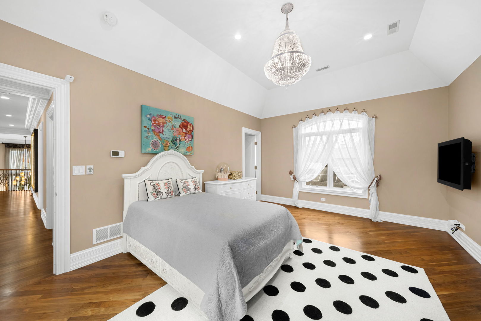 A masterpiece of architectural elegance and modern luxury, this all-brick and stone estate is a sanctuary of sophistication. Beyond its gated entry, a heated four-car garage with a Tesla charger sets the stage for unparalleled comfort. A grand two-story foyer with travertine marble flooring, coffered ceilings, and exquisite crown molding welcomes you inside. The living and dining rooms impress with diagonally laid hardwood floors, recessed lighting, and intricate molding, seamlessly connecting through arched doorways. The chef's kitchen is a culinary dream, boasting travertine marble floors, granite countertops, and high-end Wolf and Thermador appliances. The adjacent breakfast nook leads to a stamped concrete patio, perfect for morning coffee. The family room, with its soaring ceilings and limestone-framed gas fireplace, offers a refined yet cozy retreat. A versatile office or 5th ensuite bedroom, a mudroom with built-in lockers, and a well-equipped laundry room complete the main level. The primary suite is a private haven, featuring hardwood floors, a tray ceiling, and a custom walk-in closet. Its spa-like bath indulges with heated travertine floors, dual granite vanities, a rainfall shower with multiple sprays, steam shower and an airjet tub. Three additional ensuite bedrooms, each with bespoke finishes, ensure comfort and privacy along with an additional finished flex space perfect for additional play or craft room. The third-floor finished art studio is illuminated by recessed lighting, offers flexibility for creative pursuits or simply a total private work from home space. Designed for entertaining, the lower level presents a plush theater with tiered seating, a recreation room with a gas fireplace, and a sophisticated wet bar with high-end appliances and seating for four. A guest bedroom and bath offer additional accommodations and the best part of the lower level - the dry sauna! Step outside to a private resort-like oasis, where a saltwater fiberglass pool with an electric cover, slide, and water features takes center stage. A concrete sports court is primed for endless activities, while a gazebo with a built-in grill invites al fresco dining. Additional features include a stamped concrete driveway, wood deck, Ecobee thermostat system, four Trane furnaces with Aprilaire humidifiers, a Generac generator, a sprinkler system, an electric fence, a sauna, dual 75-gallon water heaters, and a sump pump with battery backup. Seamlessly blending timeless elegance with modern convenience, this extraordinary residence is the epitome of luxury living.