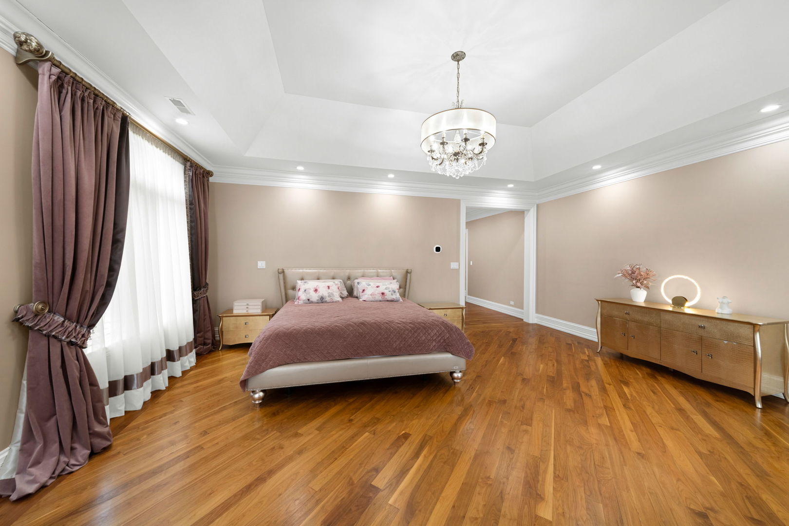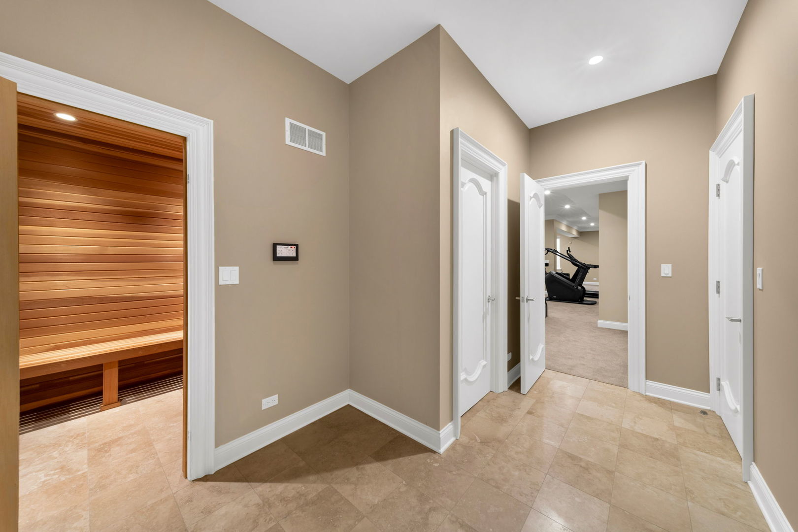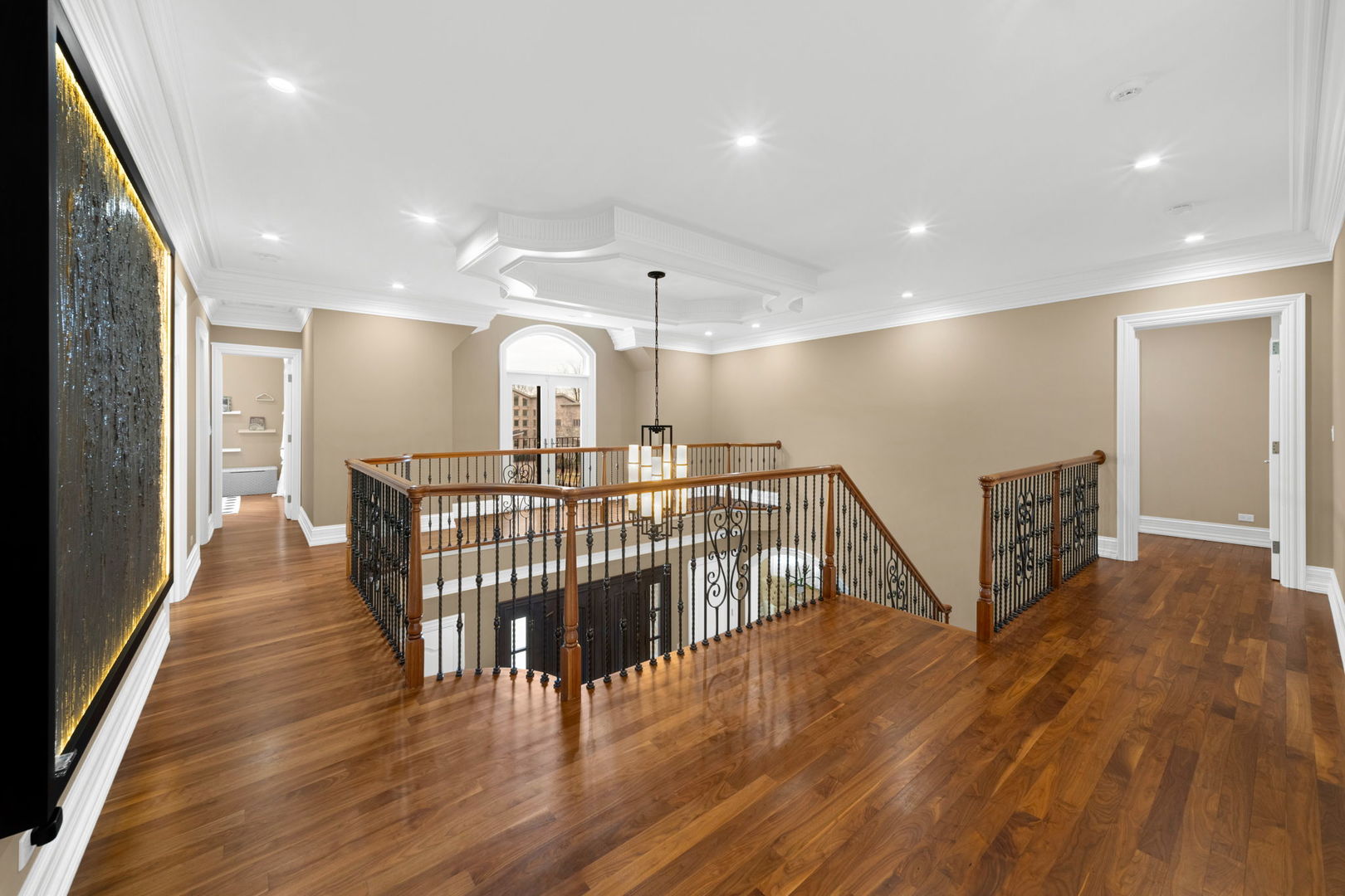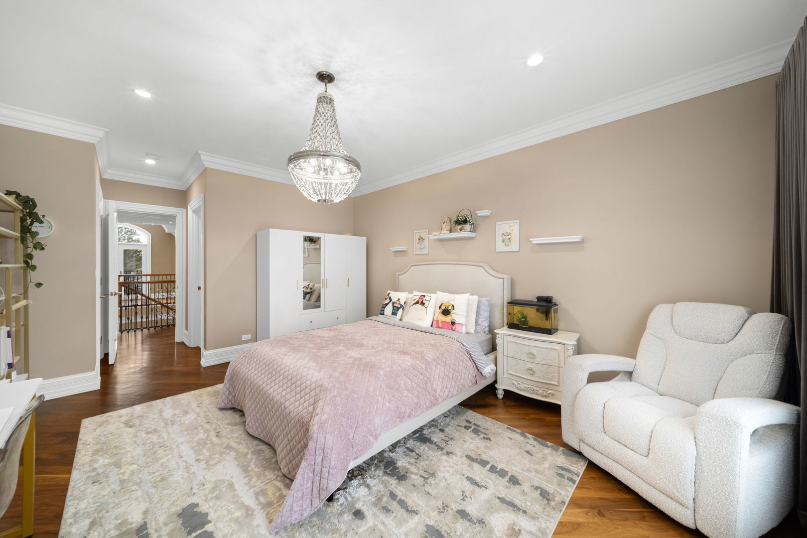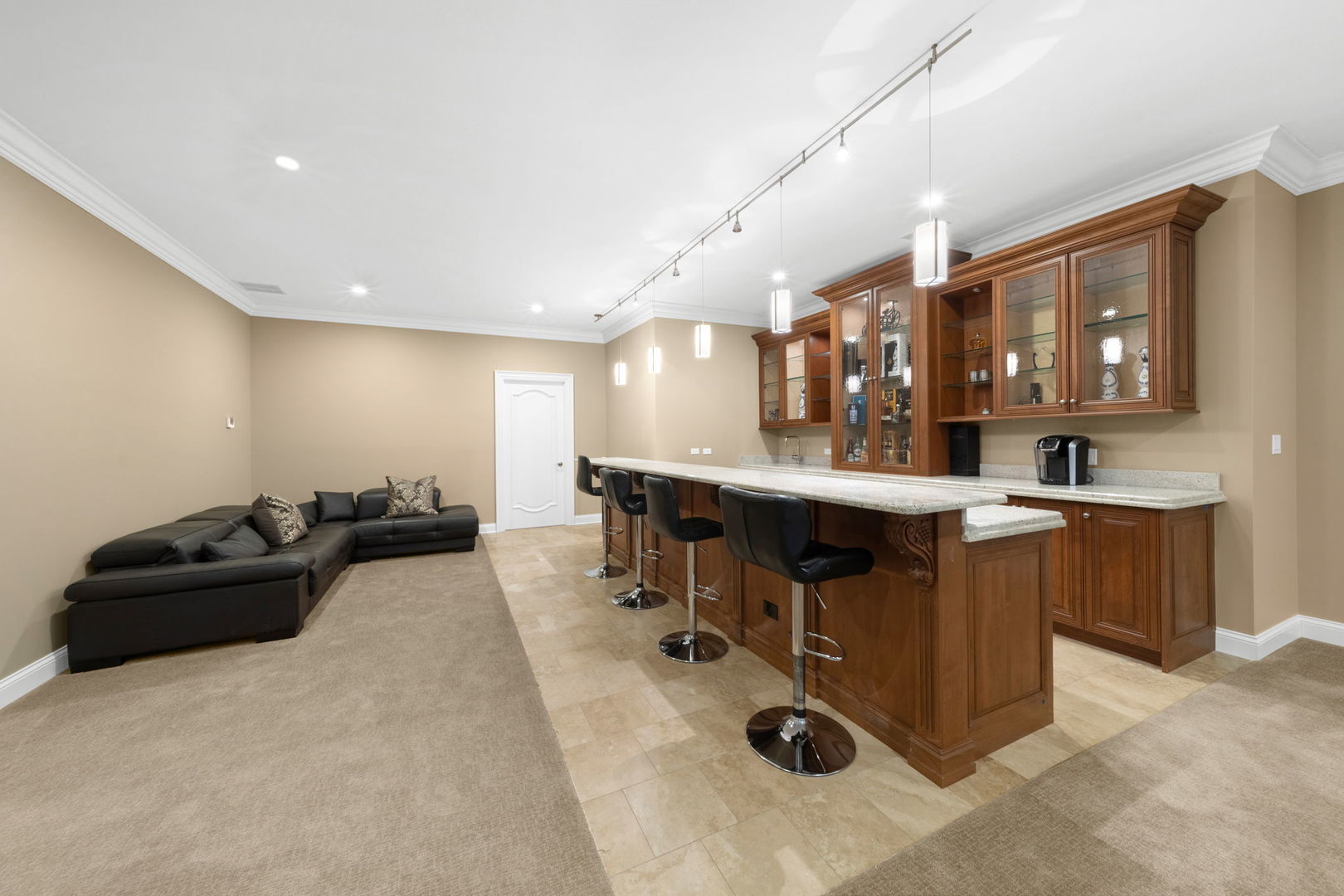A masterpiece of architectural elegance and modern luxury, this all-brick and stone estate is a sanctuary of sophistication. Beyond its gated entry, a heated four-car garage with a Tesla charger sets the stage for unparalleled comfort. A grand two-story foyer with travertine marble flooring, coffered ceilings, and exquisite crown molding welcomes you inside. The living and dining rooms impress with diagonally laid hardwood floors, recessed lighting, and intricate molding, seamlessly connecting through arched doorways. The chef's kitchen is a culinary dream, boasting travertine marble floors, granite countertops, and high-end Wolf and Thermador appliances. The adjacent breakfast nook leads to a stamped concrete patio, perfect for morning coffee. The family room, with its soaring ceilings and limestone-framed gas fireplace, offers a refined yet cozy retreat. A versatile office or 5th ensuite bedroom, a mudroom with built-in lockers, and a well-equipped laundry room complete the main level. The primary suite is a private haven, featuring hardwood floors, a tray ceiling, and a custom walk-in closet. Its spa-like bath indulges with heated travertine floors, dual granite vanities, a rainfall shower with multiple sprays, steam shower and an airjet tub. Three additional ensuite bedrooms, each with bespoke finishes, ensure comfort and privacy along with an additional finished flex space perfect for additional play or craft room. The third-floor finished art studio is illuminated by recessed lighting, offers flexibility for creative pursuits or simply a total private work from home space. Designed for entertaining, the lower level presents a plush theater with tiered seating, a recreation room with a gas fireplace, and a sophisticated wet bar with high-end appliances and seating for four. A guest bedroom and bath offer additional accommodations and the best part of the lower level - the dry sauna! Step outside to a private resort-like oasis, where a saltwater fiberglass pool with an electric cover, slide, and water features takes center stage. A concrete sports court is primed for endless activities, while a gazebo with a built-in grill invites al fresco dining. Additional features include a stamped concrete driveway, wood deck, Ecobee thermostat system, four Trane furnaces with Aprilaire humidifiers, a Generac generator, a sprinkler system, an electric fence, a sauna, dual 75-gallon water heaters, and a sump pump with battery backup. Seamlessly blending timeless elegance with modern convenience, this extraordinary residence is the epitome of luxury living.