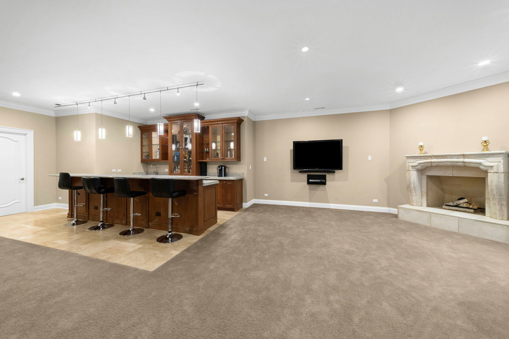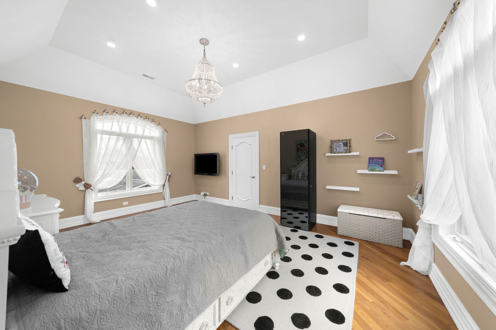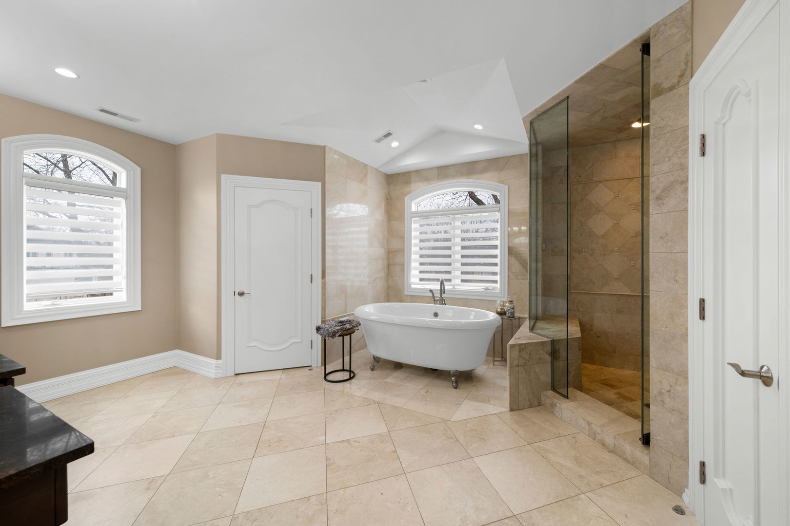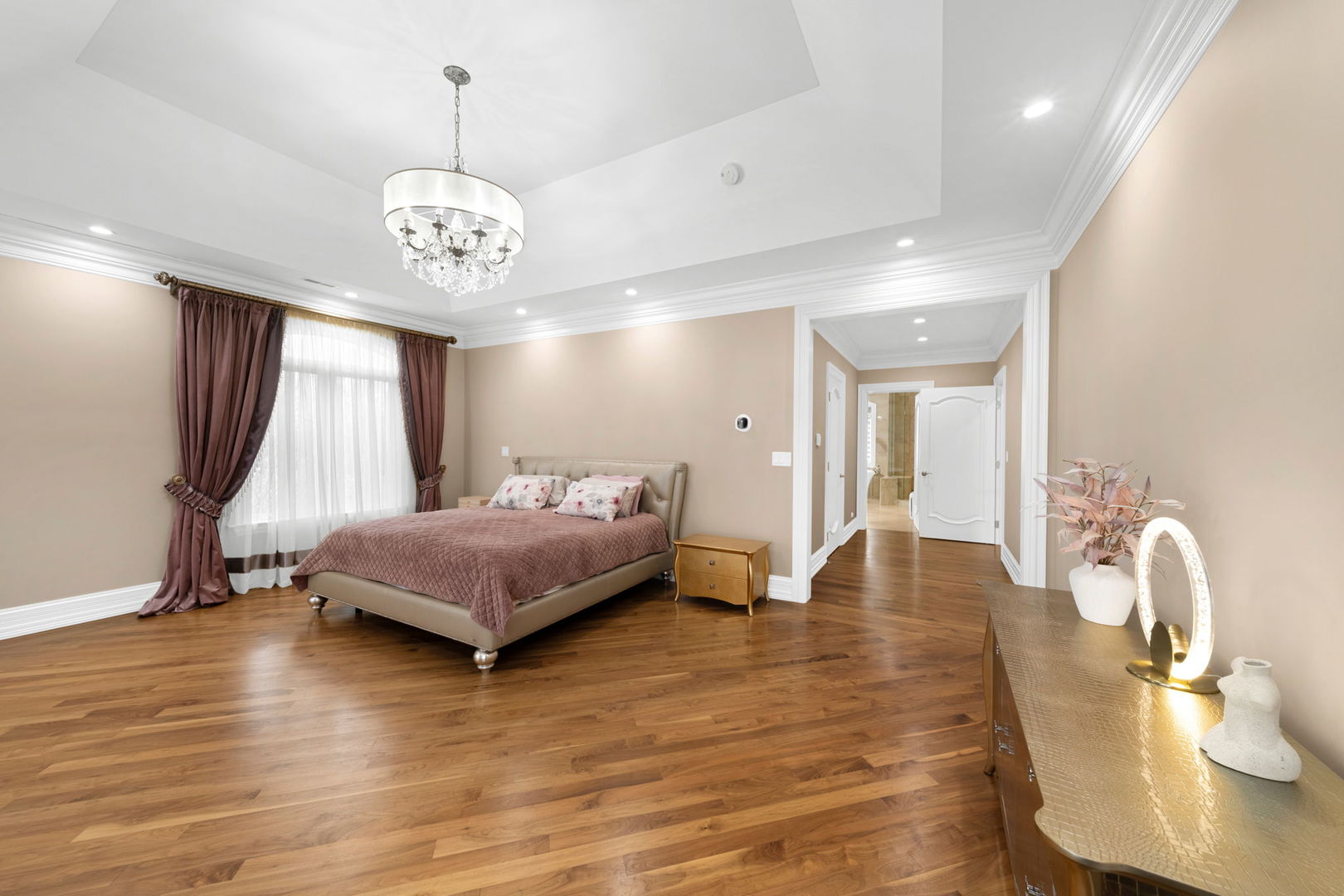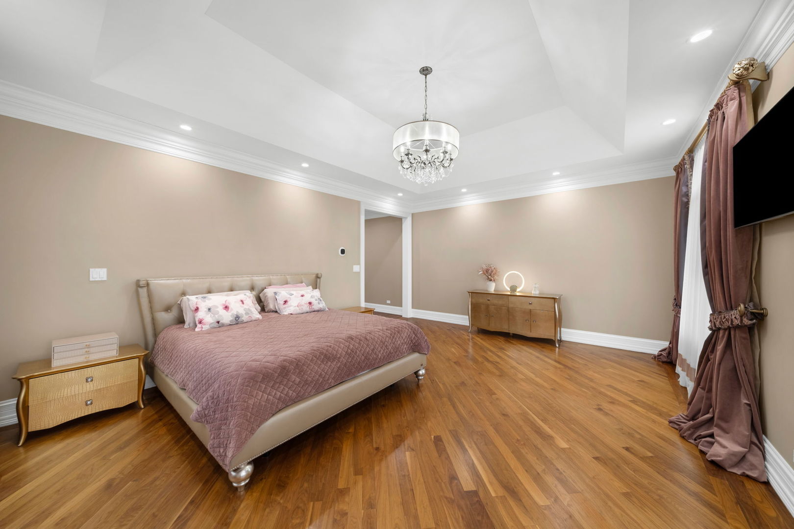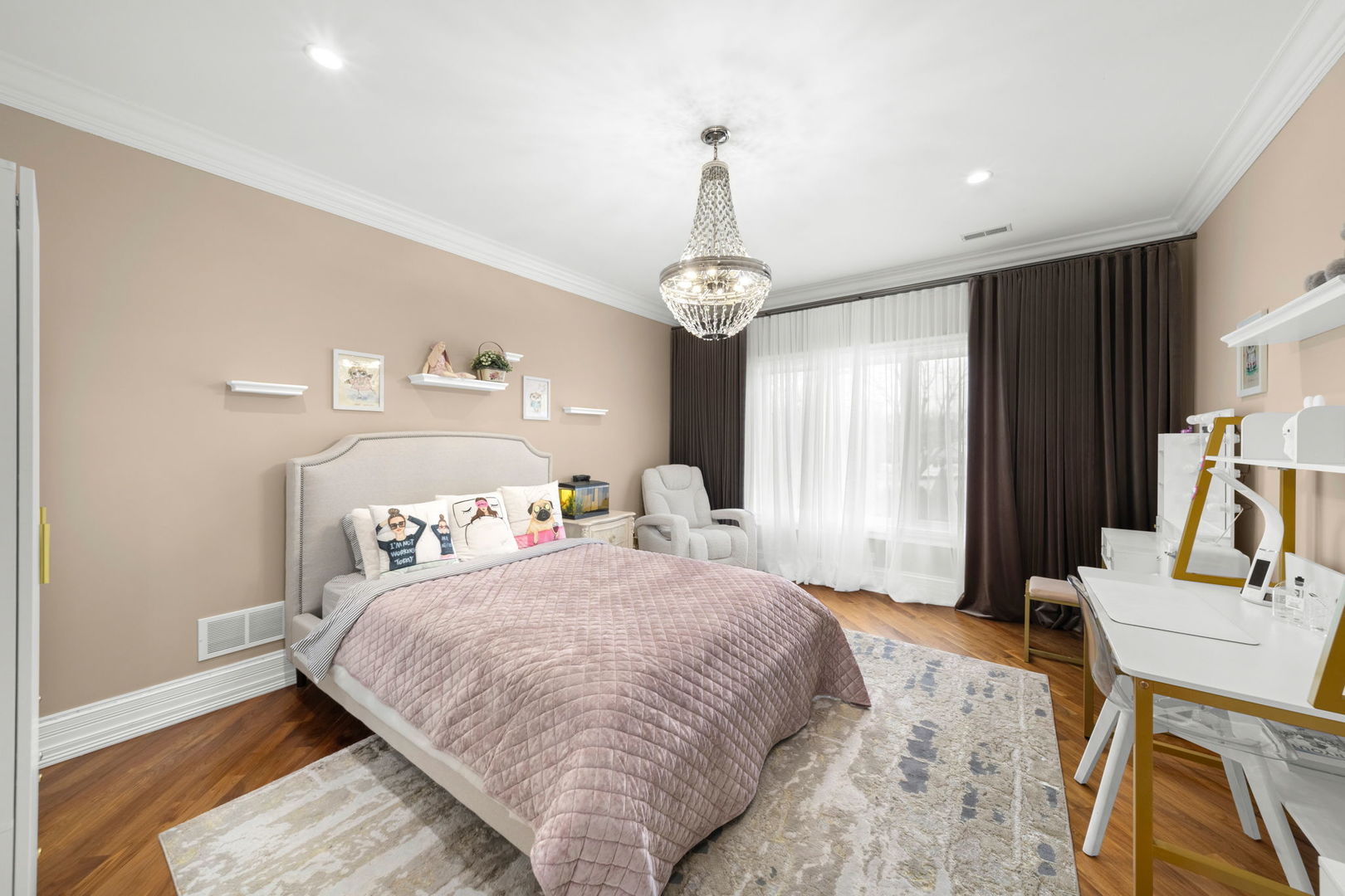 A masterpiece of architectural elegance and modern luxury, this all-brick and stone estate is a sanctuary of sophistication. Beyond its gated entry, a heated four-car garage with a Tesla charger sets the stage for unparalleled comfort. A grand two-story foyer with travertine marble flooring, coffered ceilings, and exquisite crown molding welcomes you inside. The living and dining rooms impress with diagonally laid hardwood floors, recessed lighting, and intricate molding, seamlessly connecting through arched doorways. The chef's kitchen is a culinary dream, boasting travertine marble floors, granite countertops, and high-end Wolf and Thermador appliances. The adjacent breakfast nook leads to a stamped concrete patio, perfect for morning coffee. The family room, with its soaring ceilings and limestone-framed gas fireplace, offers a refined yet cozy retreat. A versatile office or 5th ensuite bedroom, a mudroom with built-in lockers, and a well-equipped laundry room complete the main level. The primary suite is a private haven, featuring hardwood floors, a tray ceiling, and a custom walk-in closet. Its spa-like bath indulges with heated travertine floors, dual granite vanities, a rainfall shower with multiple sprays, steam shower and an airjet tub. Three additional ensuite bedrooms, each with bespoke finishes, ensure comfort and privacy along with an additional finished flex space perfect for additional play or craft room. The third-floor finished art studio is illuminated by recessed lighting, offers flexibility for creative pursuits or simply a total private work from home space. Designed for entertaining, the lower level presents a plush theater with tiered seating, a recreation room with a gas fireplace, and a sophisticated wet bar with high-end appliances and seating for four. A guest bedroom and bath offer additional accommodations and the best part of the lower level - the dry sauna! Step outside to a private resort-like oasis, where a saltwater fiberglass pool with an electric cover, slide, and water features takes center stage. A concrete sports court is primed for endless activities, while a gazebo with a built-in grill invites al fresco dining. Additional features include a stamped concrete driveway, wood deck, Ecobee thermostat system, four Trane furnaces with Aprilaire humidifiers, a Generac generator, a sprinkler system, an electric fence, a sauna, dual 75-gallon water heaters, and a sump pump with battery backup. Seamlessly blending timeless elegance with modern convenience, this extraordinary residence is the epitome of luxury living.