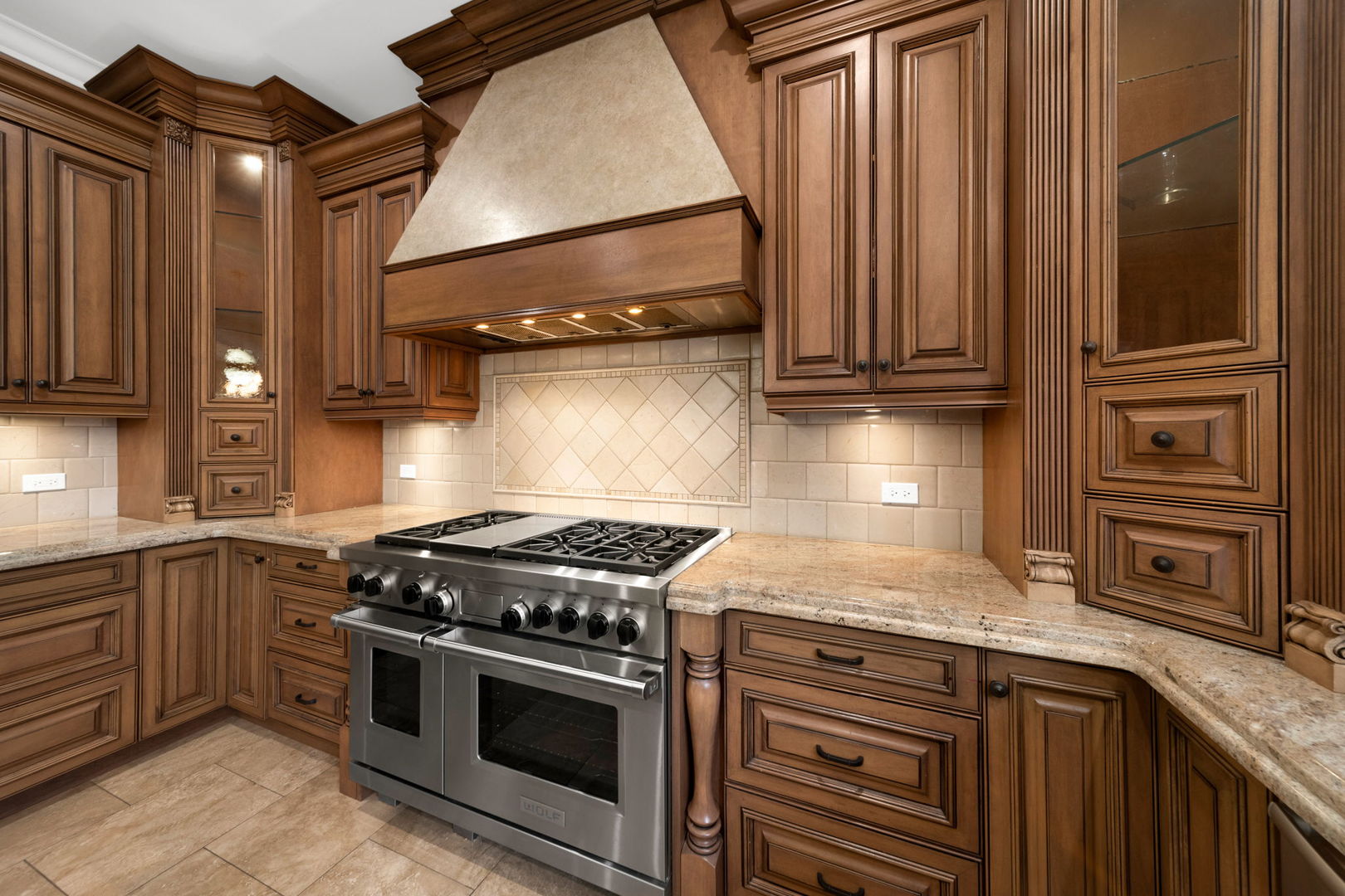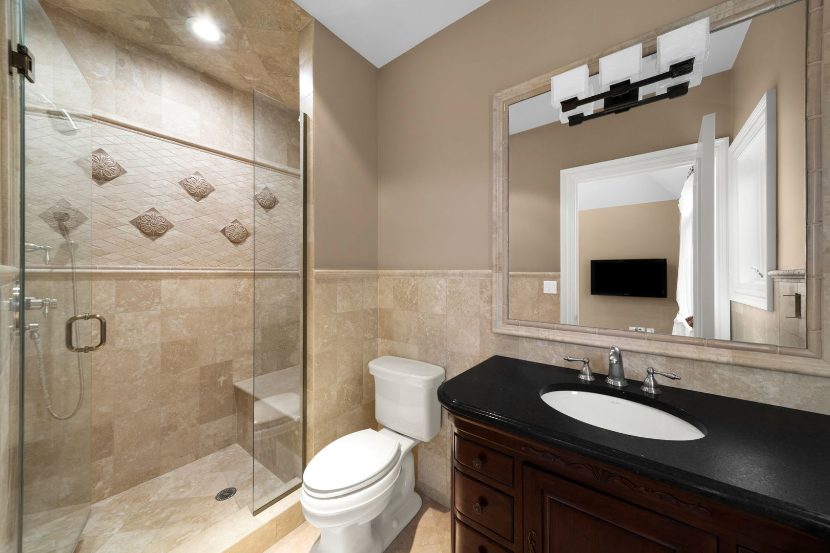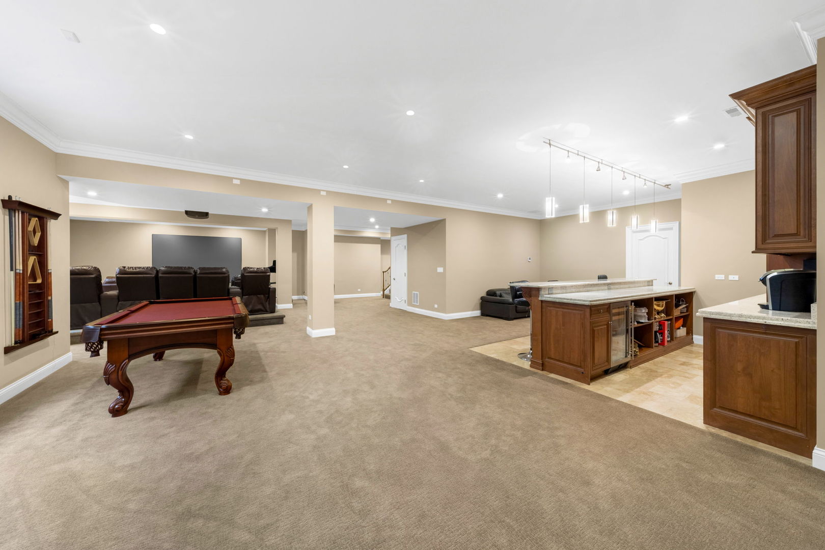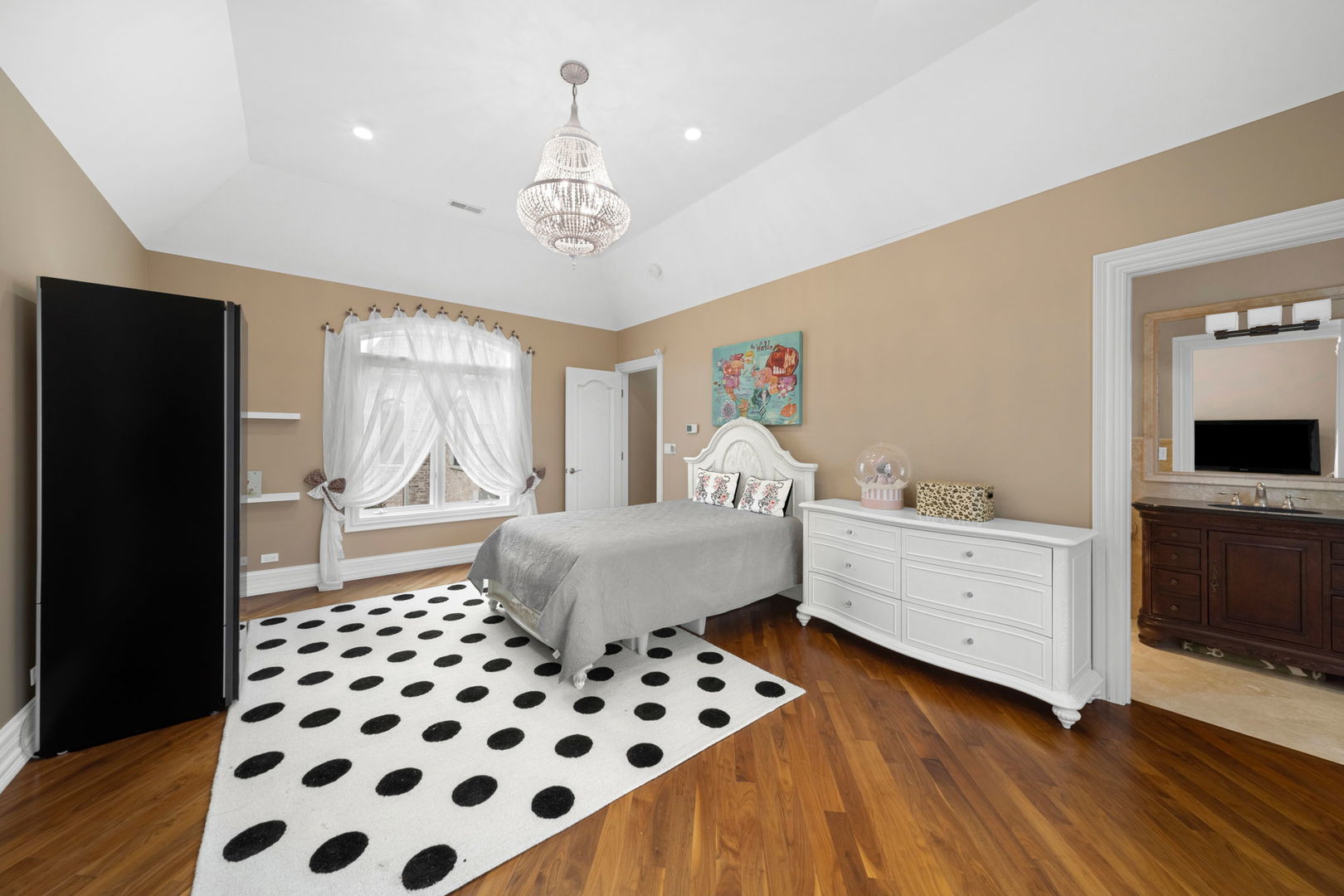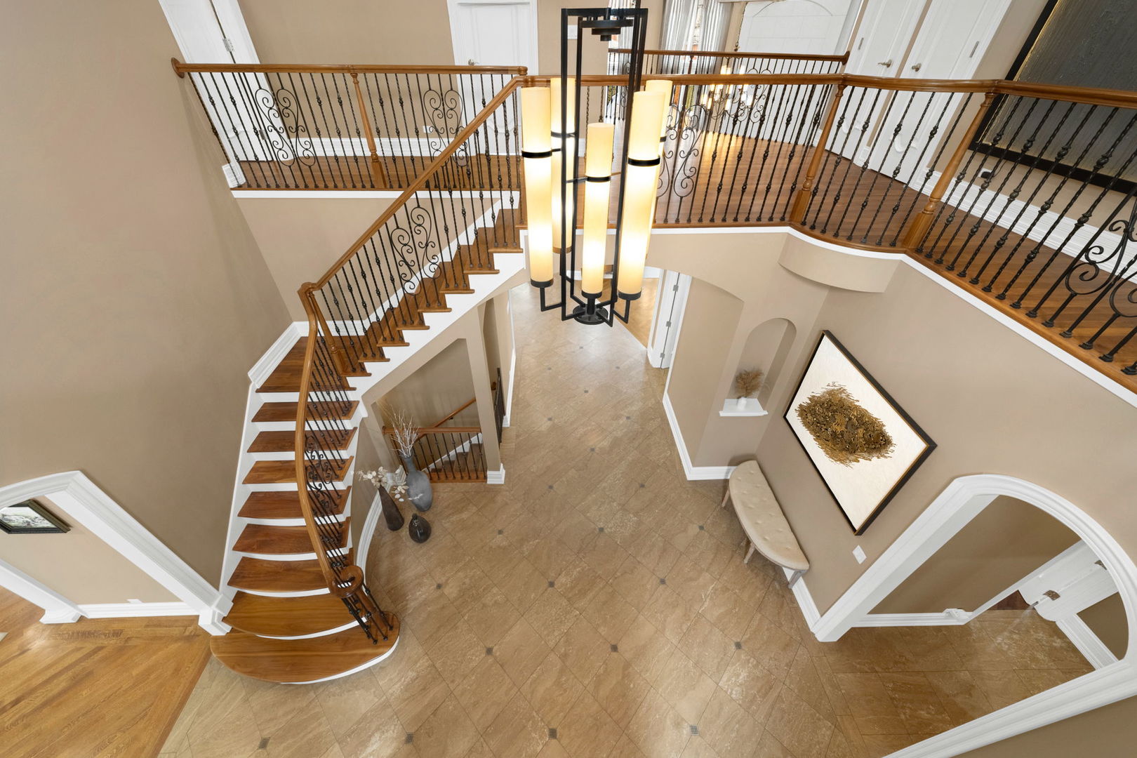A masterpiece of architectural elegance and modern luxury, this all-brick and stone estate is a sanctuary of sophistication. Beyond its gated entry, a heated four-car garage with a Tesla charger sets the stage for unparalleled comfort. A grand two-story foyer with travertine marble flooring, coffered ceilings, and exquisite crown molding welcomes you inside. The living and dining rooms impress with diagonally laid hardwood floors, recessed lighting, and intricate molding, seamlessly connecting through arched doorways. The chef's kitchen is a culinary dream, boasting travertine marble floors, granite countertops, and high-end Wolf and Thermador appliances. The adjacent breakfast nook leads to a stamped concrete patio, perfect for morning coffee. The family room, with its soaring ceilings and limestone-framed gas fireplace, offers a refined yet cozy retreat. A versatile office or 5th ensuite bedroom, a mudroom with built-in lockers, and a well-equipped laundry room complete the main level. The primary suite is a private haven, featuring hardwood floors, a tray ceiling, and a custom walk-in closet. Its spa-like bath indulges with heated travertine floors, dual granite vanities, a rainfall shower with multiple sprays, steam shower and an airjet tub. Three additional ensuite bedrooms, each with bespoke finishes, ensure comfort and privacy along with an additional finished flex space perfect for additional play or craft room. The third-floor finished art studio is illuminated by recessed lighting, offers flexibility for creative pursuits or simply a total private work from home space. Designed for entertaining, the lower level presents a plush theater with tiered seating, a recreation room with a gas fireplace, and a sophisticated wet bar with high-end appliances and seating for four. A guest bedroom and bath offer additional accommodations and the best part of the lower level - the dry sauna! Step outside to a private resort-like oasis, where a saltwater fiberglass pool with an electric cover, slide, and water features takes center stage. A concrete sports court is primed for endless activities, while a gazebo with a built-in grill invites al fresco dining. Additional features include a stamped concrete driveway, wood deck, Ecobee thermostat system, four Trane furnaces with Aprilaire humidifiers, a Generac generator, a sprinkler system, an electric fence, a sauna, dual 75-gallon water heaters, and a sump pump with battery backup. Seamlessly blending timeless elegance with modern convenience, this extraordinary residence is the epitome of luxury living.