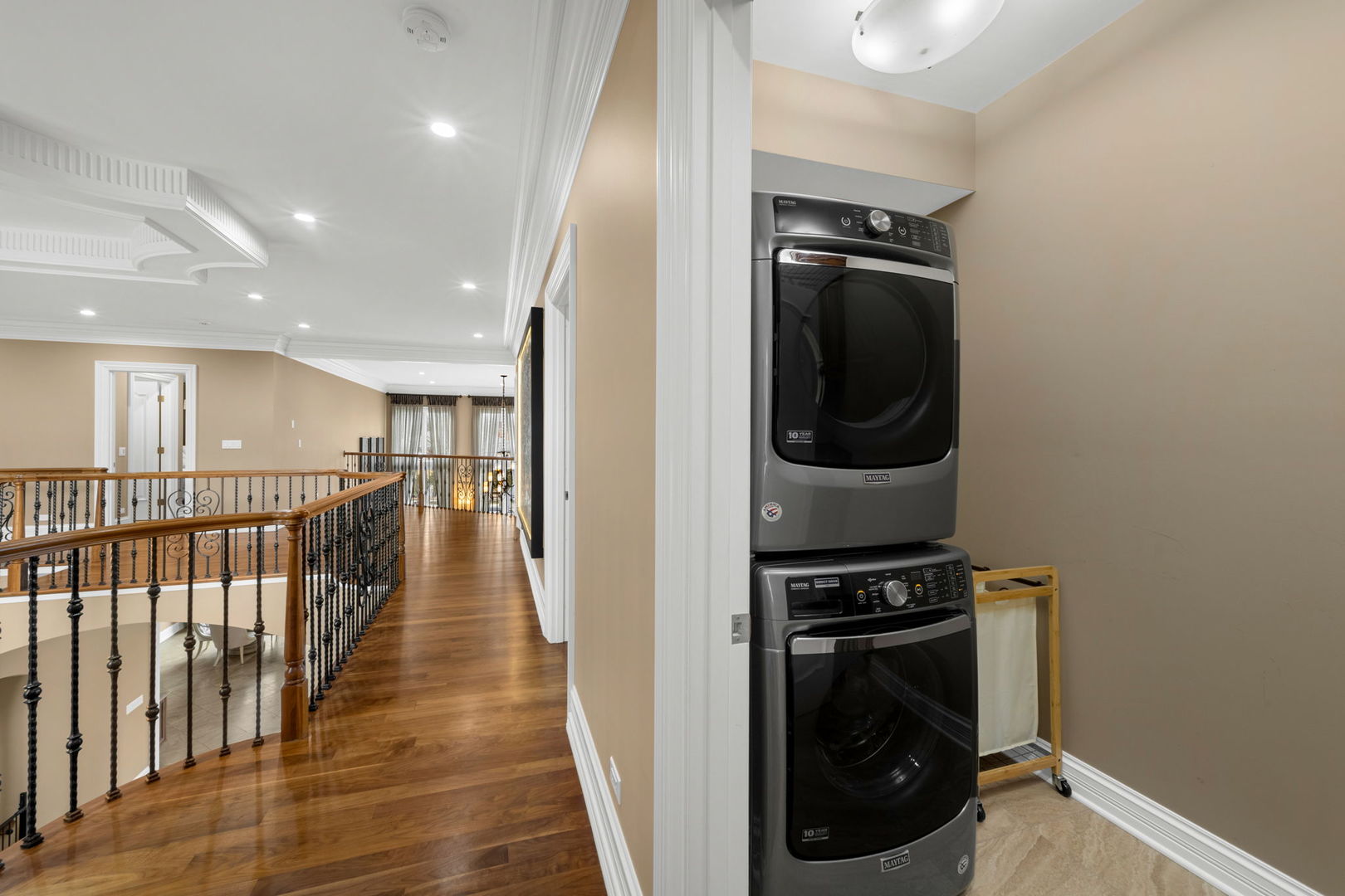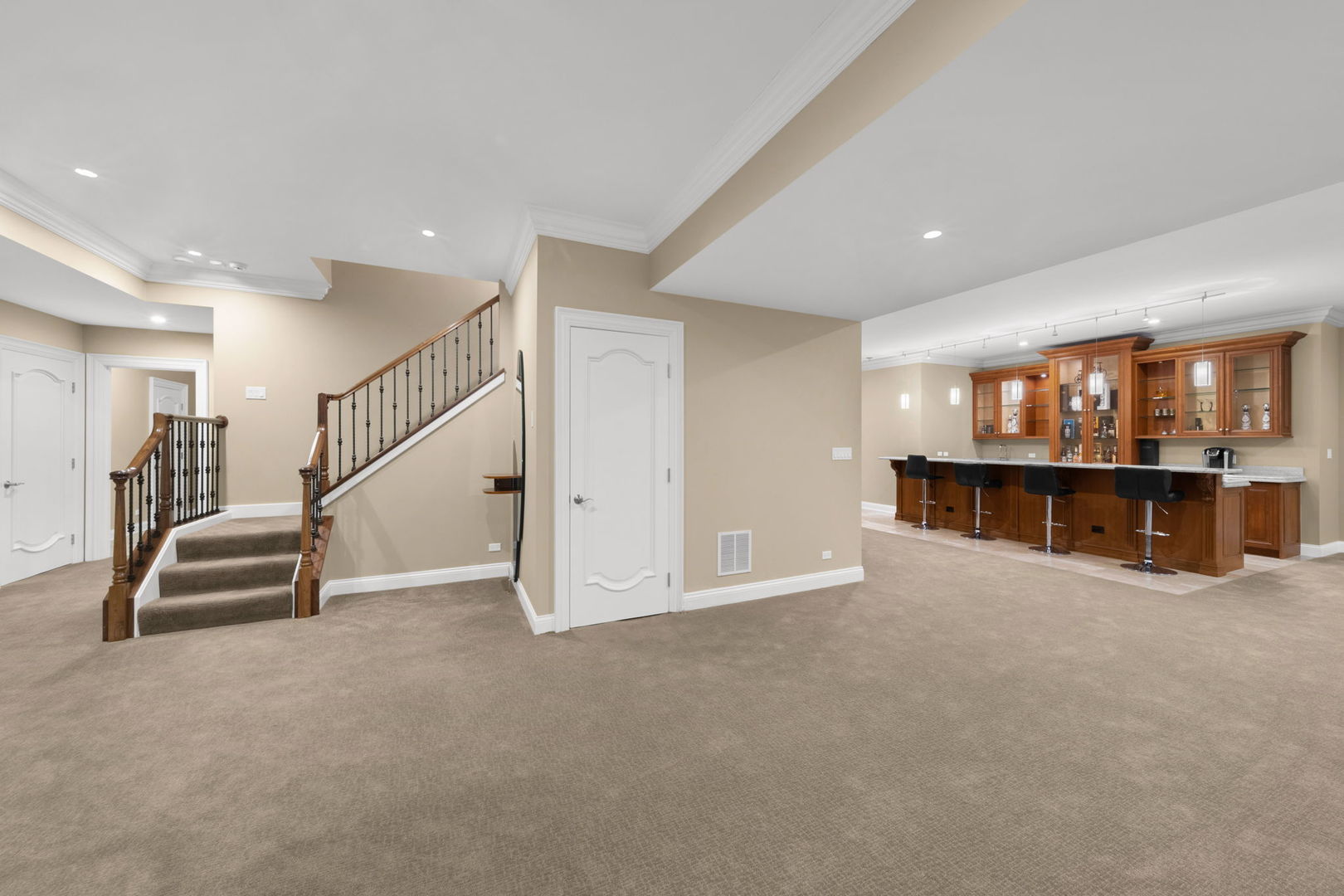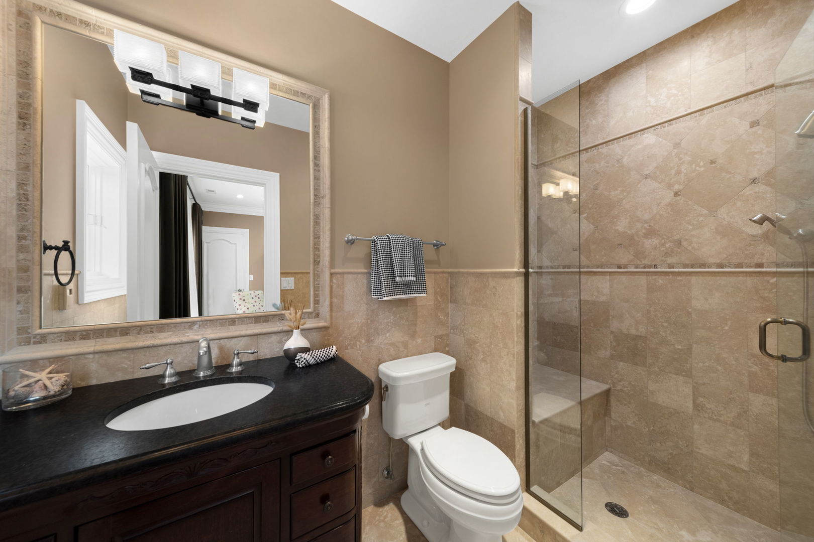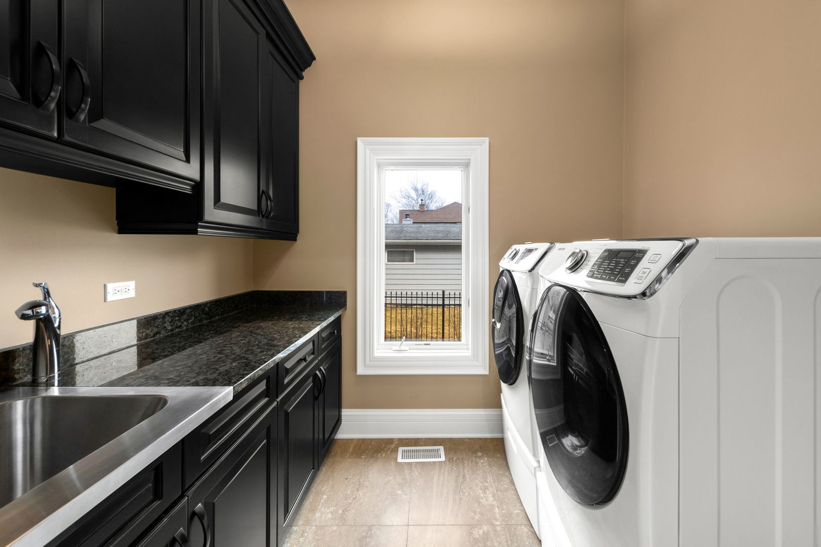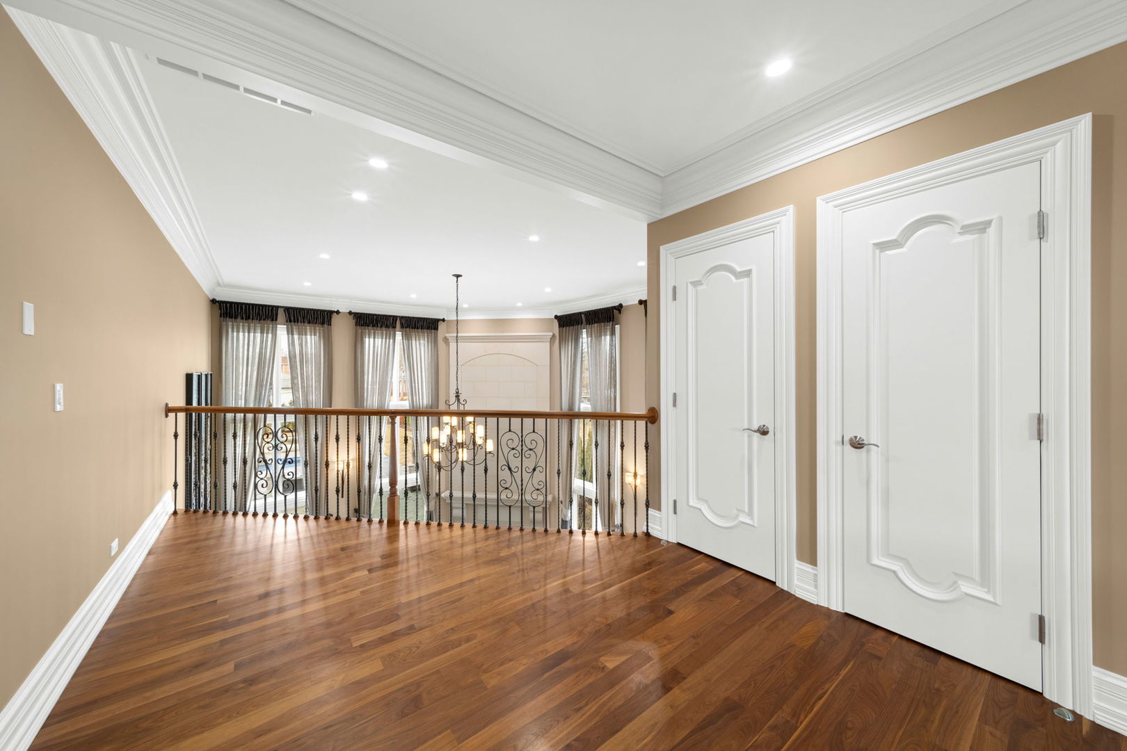 A masterpiece of architectural elegance and modern luxury, this all-brick and stone estate is a sanctuary of sophistication. Beyond its gated entry, a heated four-car garage with a Tesla charger sets the stage for unparalleled comfort. A grand two-story foyer with travertine marble flooring, coffered ceilings, and exquisite crown molding welcomes you inside. The living and dining rooms impress with diagonally laid hardwood floors, recessed lighting, and intricate molding, seamlessly connecting through arched doorways. The chef's kitchen is a culinary dream, boasting travertine marble floors, granite countertops, and high-end Wolf and Thermador appliances. The adjacent breakfast nook leads to a stamped concrete patio, perfect for morning coffee. The family room, with its soaring ceilings and limestone-framed gas fireplace, offers a refined yet cozy retreat. A versatile office or 5th ensuite bedroom, a mudroom with built-in lockers, and a well-equipped laundry room complete the main level. The primary suite is a private haven, featuring hardwood floors, a tray ceiling, and a custom walk-in closet. Its spa-like bath indulges with heated travertine floors, dual granite vanities, a rainfall shower with multiple sprays, steam shower and an airjet tub. Three additional ensuite bedrooms, each with bespoke finishes, ensure comfort and privacy along with an additional finished flex space perfect for additional play or craft room. The third-floor finished art studio is illuminated by recessed lighting, offers flexibility for creative pursuits or simply a total private work from home space. Designed for entertaining, the lower level presents a plush theater with tiered seating, a recreation room with a gas fireplace, and a sophisticated wet bar with high-end appliances and seating for four. A guest bedroom and bath offer additional accommodations and the best part of the lower level - the dry sauna! Step outside to a private resort-like oasis, where a saltwater fiberglass pool with an electric cover, slide, and water features takes center stage. A concrete sports court is primed for endless activities, while a gazebo with a built-in grill invites al fresco dining. Additional features include a stamped concrete driveway, wood deck, Ecobee thermostat system, four Trane furnaces with Aprilaire humidifiers, a Generac generator, a sprinkler system, an electric fence, a sauna, dual 75-gallon water heaters, and a sump pump with battery backup. Seamlessly blending timeless elegance with modern convenience, this extraordinary residence is the epitome of luxury living.