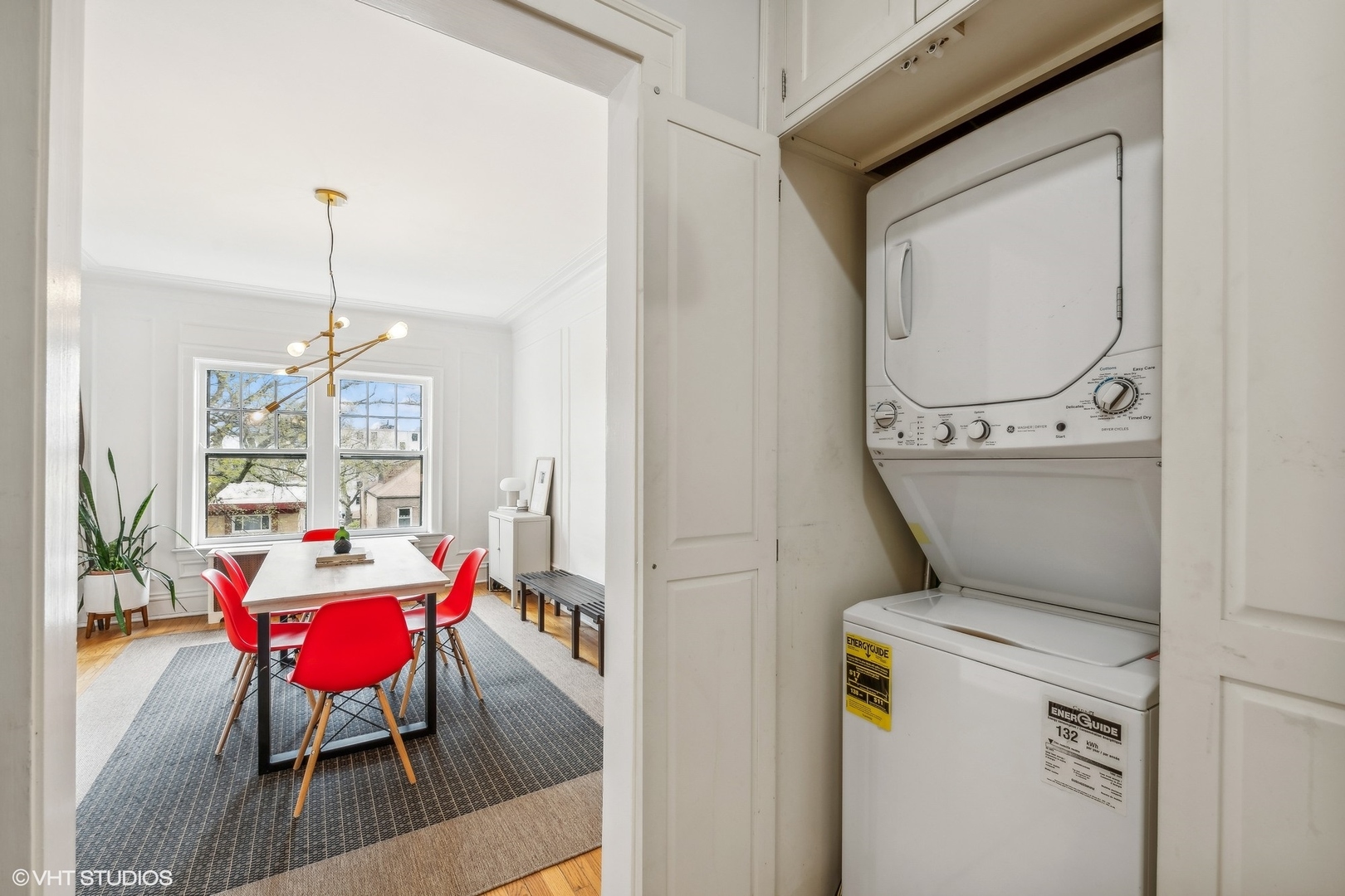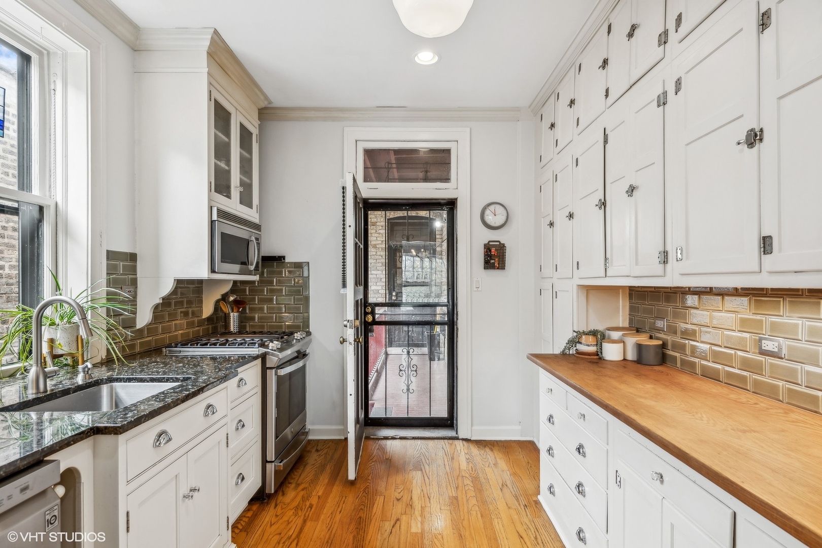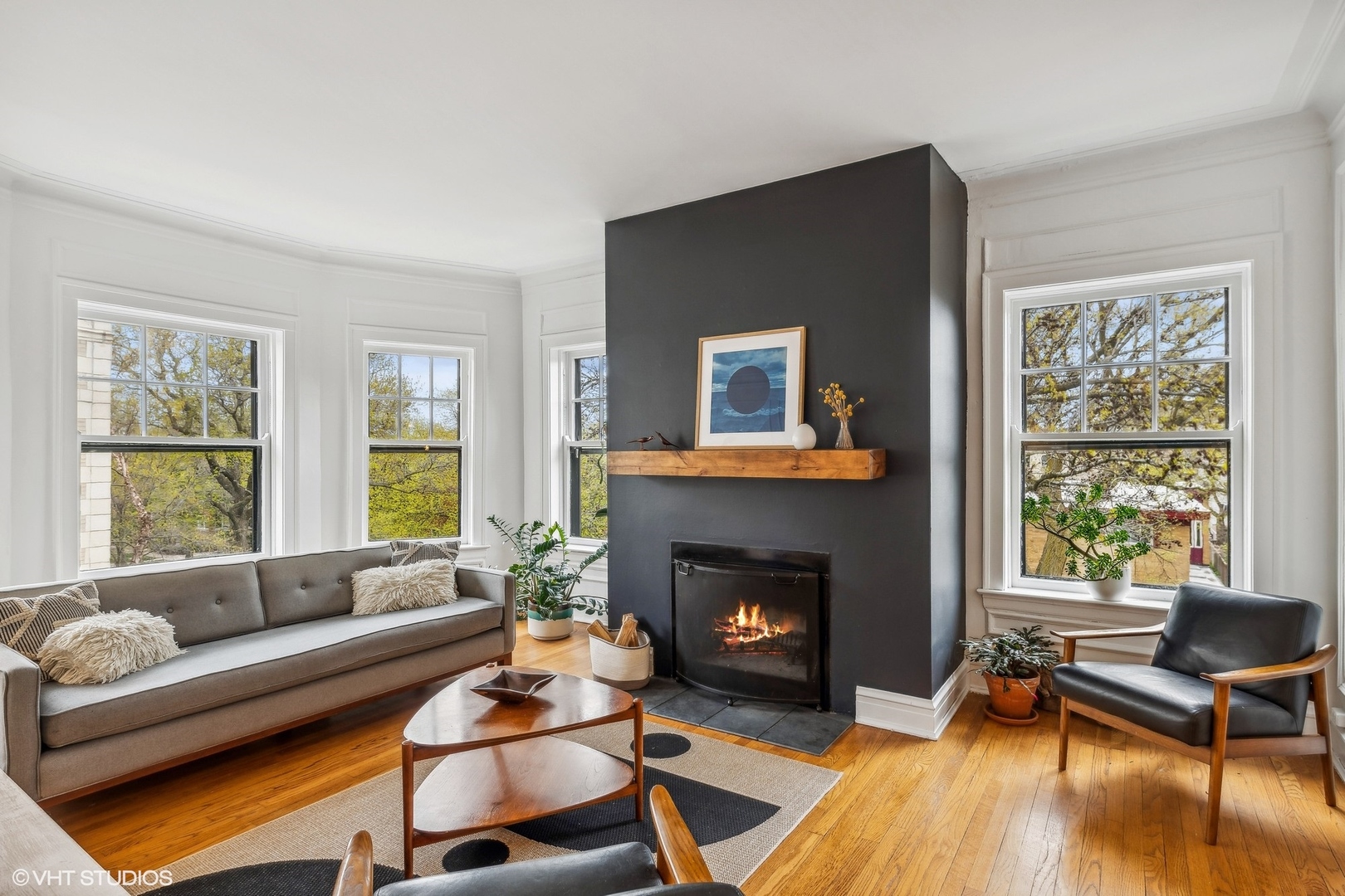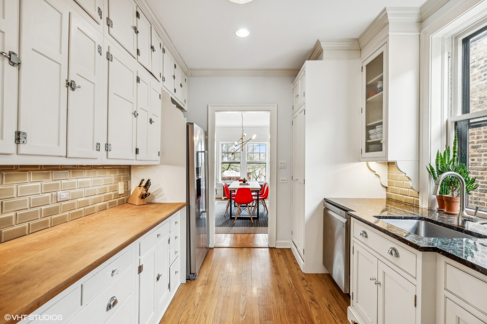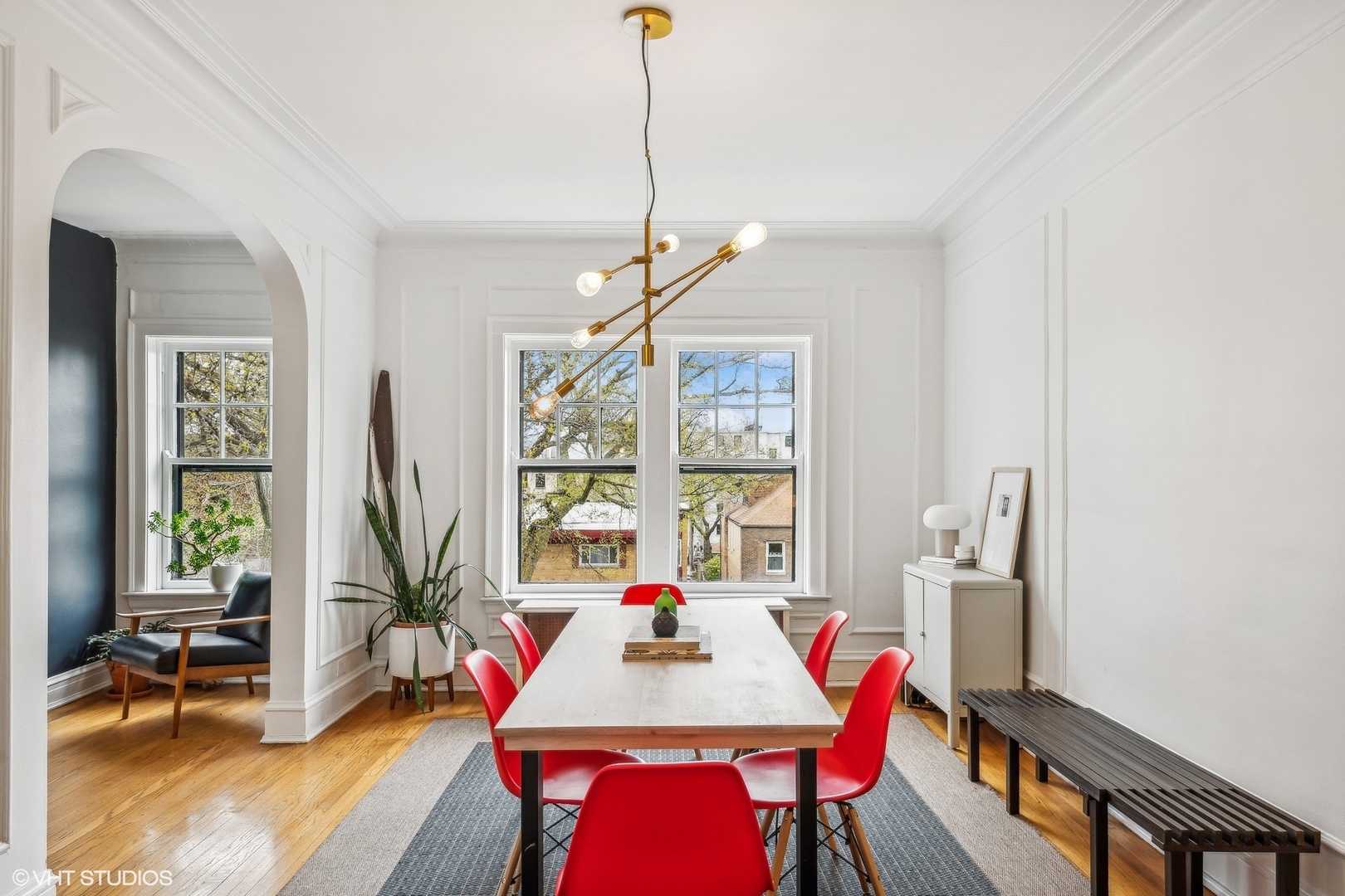 Elegance and timeless charm with this top-floor vintage condo nestled in a quaint courtyard building in the heart of South Evanston. Just a leisurely stroll from Lake Michigan, this residence boasts not only proximity to the serene waters but also offers glimpses of its beauty from select vantage points. As you enter through the foyer, you're greeted by the allure of hardwood flooring, accentuated by meticulous wall and ceiling molding, exuding sophistication at every turn. Illuminating the space is a milky white glass pendant lighting fixture, casting a soft, inviting glow. A double door coat closet provides practicality without sacrificing style. The living room embodies classic refinement with its hardwood flooring and picture frame wall molding, harmonizing effortlessly with curved doorways and a wood-burning fireplace adorned with a slate hearth and wood mantle. Accentuating the ambiance are black and gold wall sconces, adding a touch of opulence to the space. Move seamlessly into the dining room, where hardwood flooring sets the stage for gatherings and culinary delights. A sputnik brushed nickel lighting fixture adds a modern flair, while picture frame wall molding and ceiling trim enhance the room's character and charm. The kitchen is a culinary enthusiast's dream, featuring hardwood flooring, granite countertops, and a butcher block countertop, marrying functionality with style. A porcelain tile backsplash adds a touch of elegance, complementing the stainless steel sink with brushed nickel plumbing fixture. High-end appliances include a stainless steel KitchenAid refrigerator, GE stainless steel gas oven/range with griddle, Amana stainless steel microwave, LG stainless steel dishwasher, and GE washer/dryer. A door to the back staircase offers convenience and accessibility. Retreat to the primary bedroom, where hardwood flooring and crown molding create an atmosphere of tranquility. A ceiling light fan fixture provides comfort, while a closet offers ample storage space. Both hall bathrooms boast ceramic tile flooring and a shower/tub combo with ceramic tile, accompanied by a pedestal sink and a medicine cabinet for added convenience. Bedroom Two exudes mid-century modern charm with hardwood flooring and a cocoon pendant lighting fixture, while a double door closet with organizers ensures practicality without compromising style. Experience the epitome of urban-suburban living in this meticulously crafted vintage condo, where timeless elegance meets modern comfort, all within reach of the vibrant Evanston lifestyle.