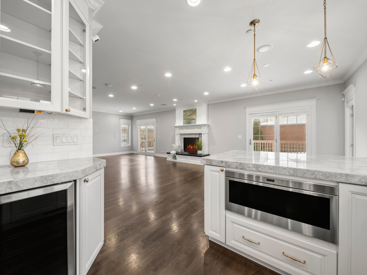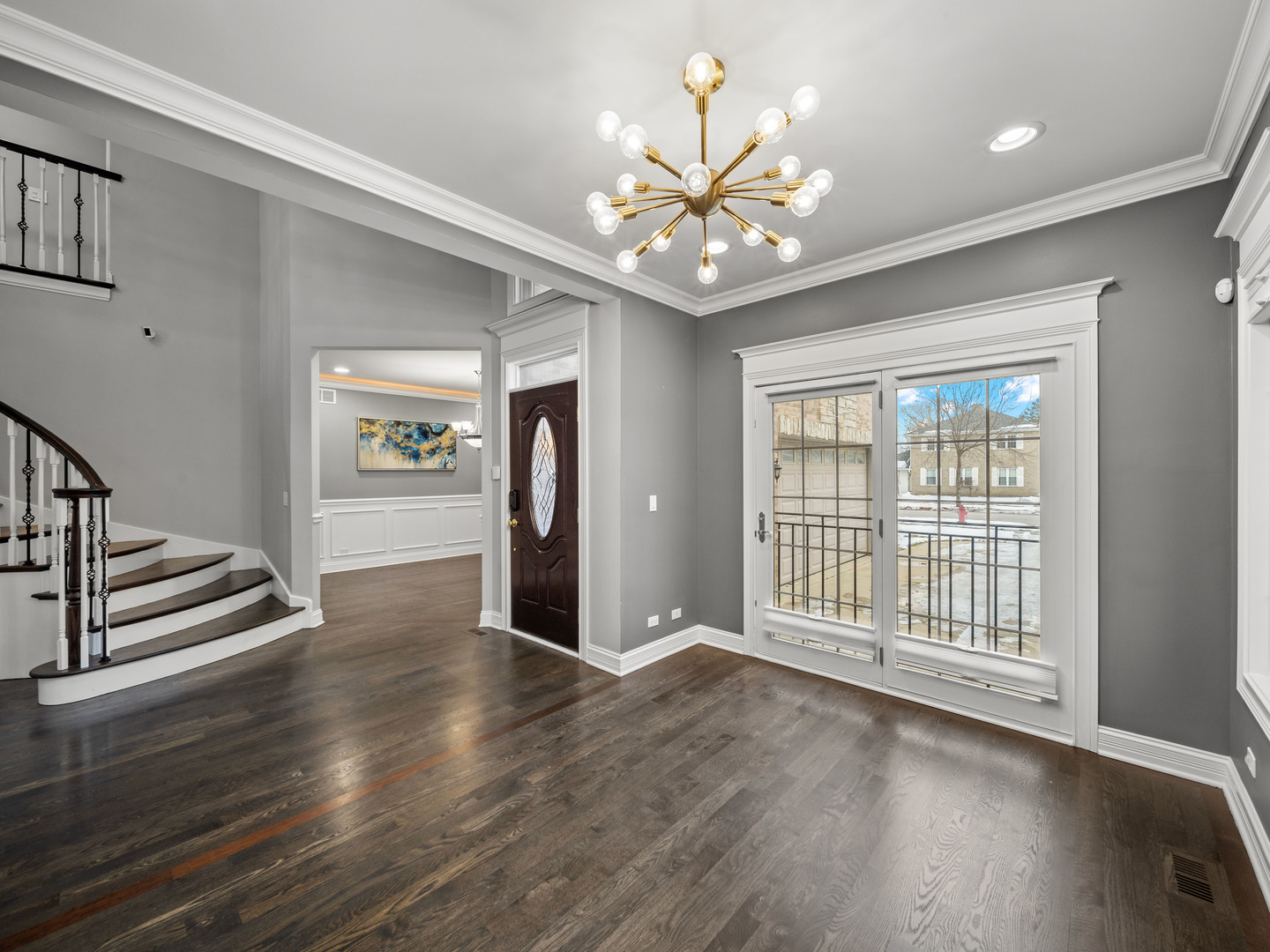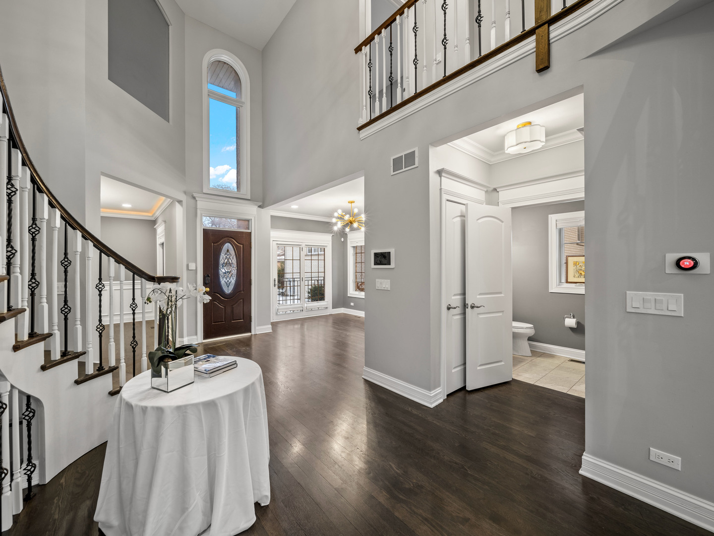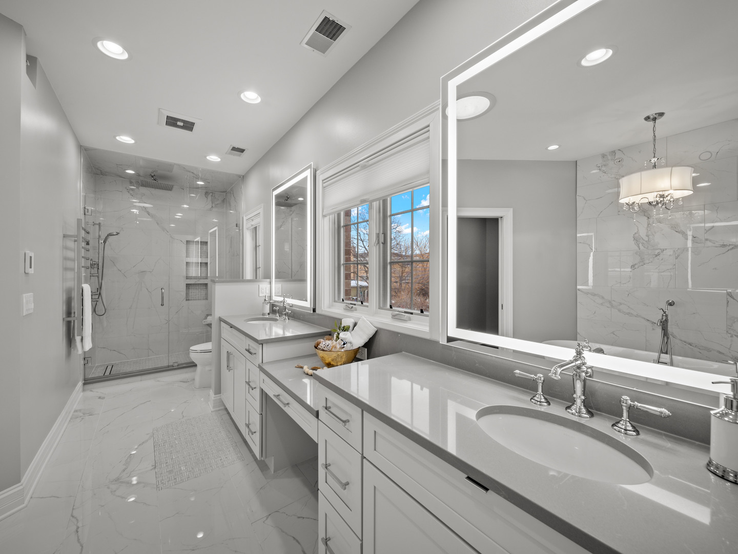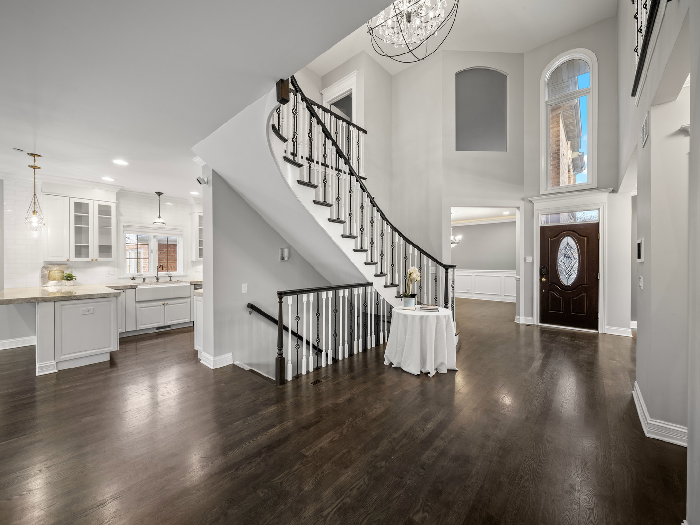 A masterclass in modern craftsmanship and timeless design, this newer-construction residence unfolds with effortless sophistication across three finished levels, introduced by a dramatic two-story foyer with a sculptural curved staircase and crystal-accented globe chandelier that sets an unmistakably elevated tone. Light-filled formal living and dining rooms, each trimmed with refined millwork, hardwood flooring, accent lighting, and multiple Juliette balconies create an elegant backdrop for entertaining. The heart of the home is a magazine-worthy chef's kitchen clad in quartzite, marble, and semi-custom cabinetry, anchored by Sub-Zero and Wolf appliances, a Shaws fireclay sink, and an extended breakfast bar that blends seamlessly into the breakfast room. The adjacent family room extends the home's chic yet inviting energy with a custom quartzite-surround fireplace, surround sound, and French doors opening to the newly replaced deck. A full bath and heated-floor laundry/mudroom complete the main level with thoughtful functionality. Upstairs, the sanctuary-like primary suite indulges with a private Juliette balcony, custom built-ins, a generous walk-in closet with custom built ins, and a spa-level bath featuring heated marble-inlay floors, dual quartz vanities, LED mirrors, a rainfall shower with body sprays, heated towel bar, and a standalone soaking tub. Three additional bedrooms-two with Juliette balconies-include an ensuite, a semi-ensuite, and beautifully curated finishes throughout. The fully finished lower level elevates leisure to a cinematic experience with an expansive recreation room boasting a gas fireplace, home theater wired for 11.4.2 surround sound, a designer bar with hammered stainless sink, mirrored backsplash, dual refrigeration, and seating for four, alongside a dedicated exercise room, fifth bedroom, full bath, and ample storage. Enhanced with smart-home controls, upgraded mechanicals, 200-amp service, sump with backup, and a long list of thoughtful updates-including roof (2016), primary suite and kitchen updates, redesigned primary bath, laundry and fireplace enhancements, and a comprehensive lower-level renovation-this residence delivers turnkey luxury with the aesthetic finesse of a bespoke custom build. Perfectly situated in a highly walkable neighborhood near top-rated schools, popular restaurants, and everyday conveniences, this rare offering is where architectural intention, modern amenity, and elevated living converge in perfect harmony.