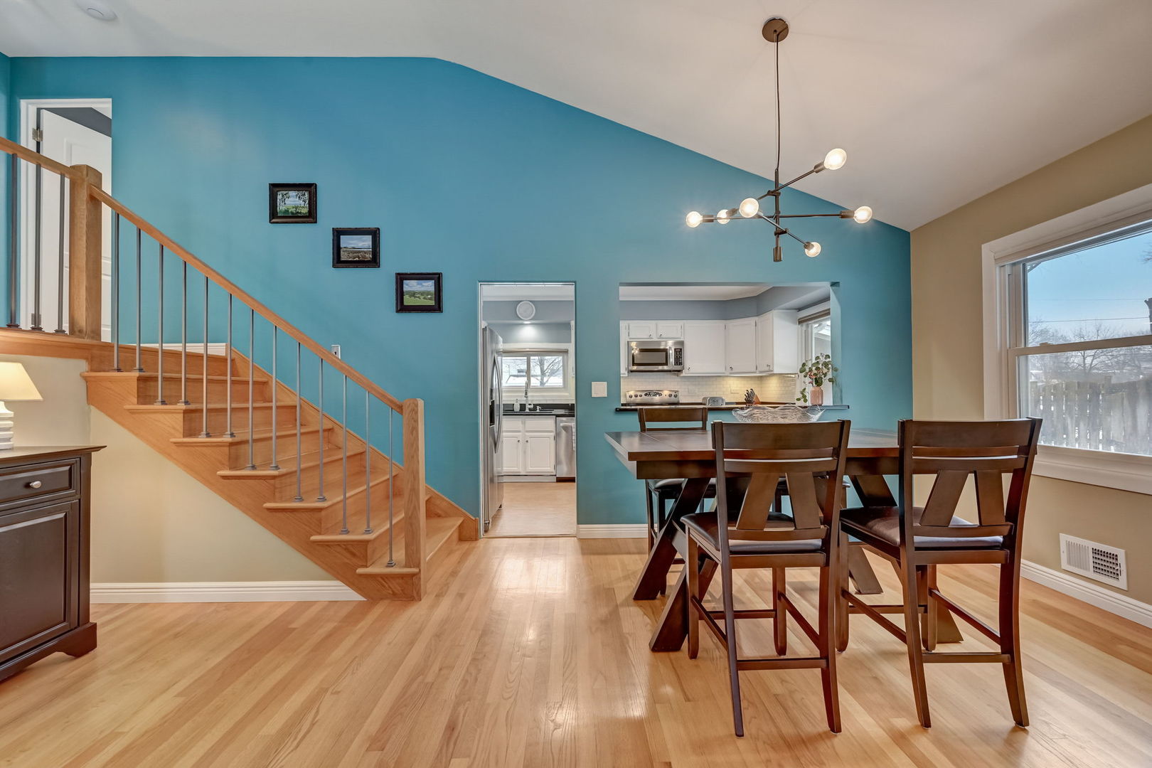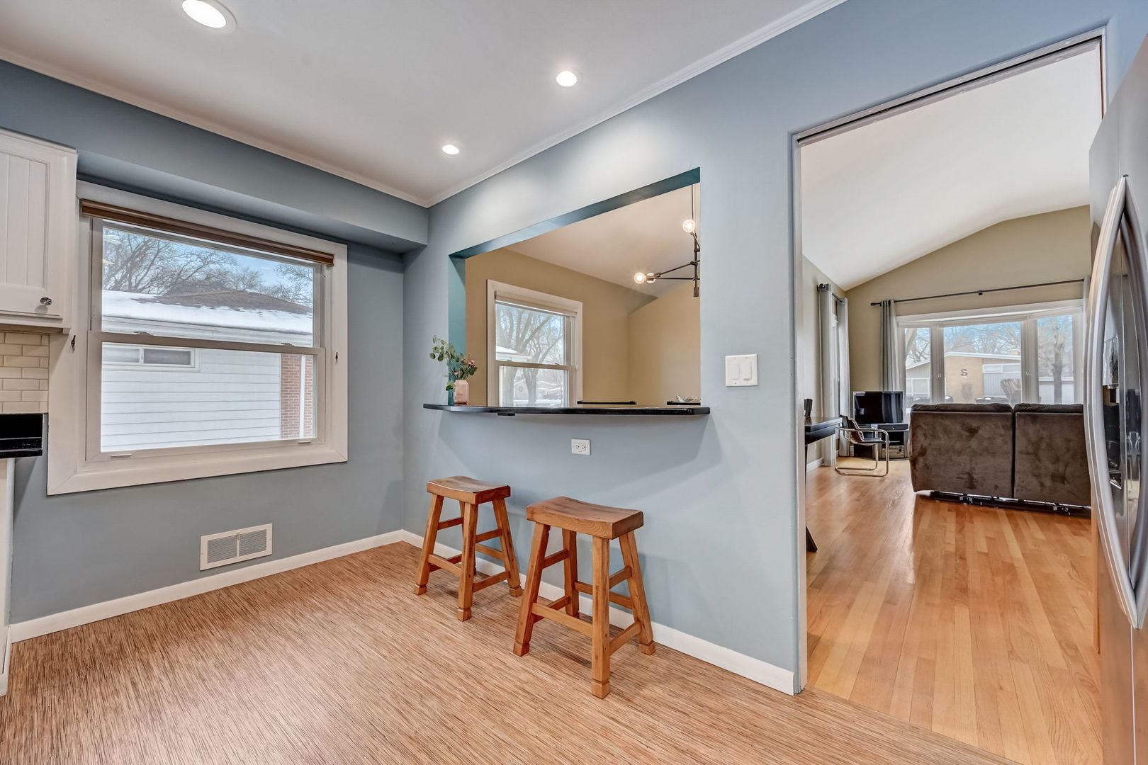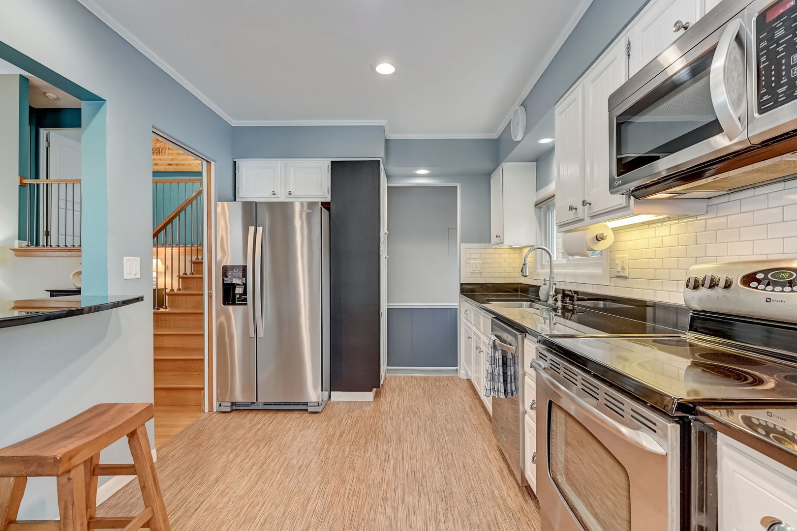 Nestled in a coveted neighborhood renowned for its top-tier schools, this charming residence presents an ideal opportunity as a delightful starter home. Recently upgraded with meticulous attention to detail, the property boasts a harmonious blend of comfort and modern elegance. Upon entering, the foyer gracefully transitions into a sunlit living room, featuring lustrous hardwood flooring, an impressive vaulted ceiling, and a picturesque bay window. The adjoining dining room, equally splendid, is adorned with hardwood floors and a chic sputnik black lighting fixture, perfect for hosting dinner parties. The heart of this home, the kitchen, is a culinary haven with vinyl flooring, sleek granite countertops, a trendy subway tile backsplash, and high-quality stainless steel appliances. The inviting see-through counter to the dining room enhances the sense of openness. The second level is a tranquil retreat comprising a primary bedroom with hardwood floors and ample storage in the double door closet. Bedrooms two and three, one with hardwood and the other carpeted, also feature double door closets, offering generous storage space. The renovated bathroom(2022) is a blend of functionality and style, showcasing vinyl flooring, a beadboard, a granite-topped vanity with a Kohler sink, and a shower/tub combo with wavy tile design. Descend to the lower level to discover a cozy family room with carpeted flooring, recessed lighting, and a stylish bar set against granite countertops, complete with cabinetry and a wine rack. This level also houses a practical laundry/mechanical room with modern LG appliances and a bathroom featuring ceramic tile flooring and a porcelain-tiled shower. The home has seen numerous updates, new furnace & a/c (2023), Refrigerator(2021), hot water heater (2021), including a new washer & dryer (2015), a complete basement renovation (2018), a new concrete driveway and patio (2020), and a comprehensive overhaul of the roof, gutters, soffit, and fascia for both house and garage (2021). Additionally, the house is equipped with a 60-amp sub-panel in the garage, a new Ecobee smart thermostat, in-wall speaker and network cabling (CAT 6), hard-wired internet wiring to the garage, LED landscape and interior lighting. Further enhancing the property's appeal are the outdoor features, including 'no-freeze' exterior faucets, an outdoor firewood rack, and newly buried Comcast cable line. With its blend of modern updates, classic charm, and a prime location, this home is a true gem, ready to provide a luxurious yet comfortable lifestyle to its new owners.